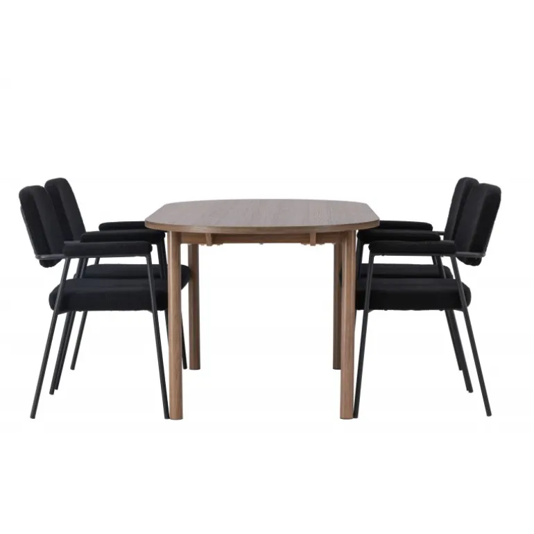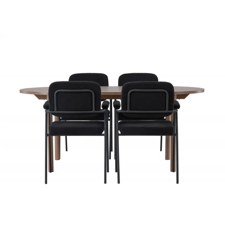 Kombinér tidløse farver med bløde materialer, indbydende former og minimalisme, og du får et Spisebordssæt i skandinavisk stil, der vil imponere både dig og dine gæster! Med vores ovale spisebord Andy får du den perfekte kombination af stil og funktionalitet. Det ovale bord er designet med et slankt og klassisk design, der vil forbedre indretningen i dit hjem. Med en tynd top i MDF i en varm, mørkebrun farve og fire klassiske cylinderformede ben udstråler Andy en følelse af raffineret enkelhed. Bordets dimensioner: 180×75 cm. Sammen med det runde spisebord tilbyder vi vores sorte spiseborde fra Yesterday-serien. Det fuldt polstrede sæde i sort bouclé stof tilbyder ikke kun et elegant og moderne look men også enestående komfort. Stolens slanke sorte metalben tilføjer et subtilt og stilfuldt præg. Derudover er de udstyret med integrerede armlæn for ekstra bekvemmelighed og afslapning. Dette indbydende Spisebordssæt vil uden tvivl imponere både dig og dine gæster. Her får du ikke kun et komplet Spisebordssæt til dit hjem, men også en oplevelse af luksus og kvalitet!