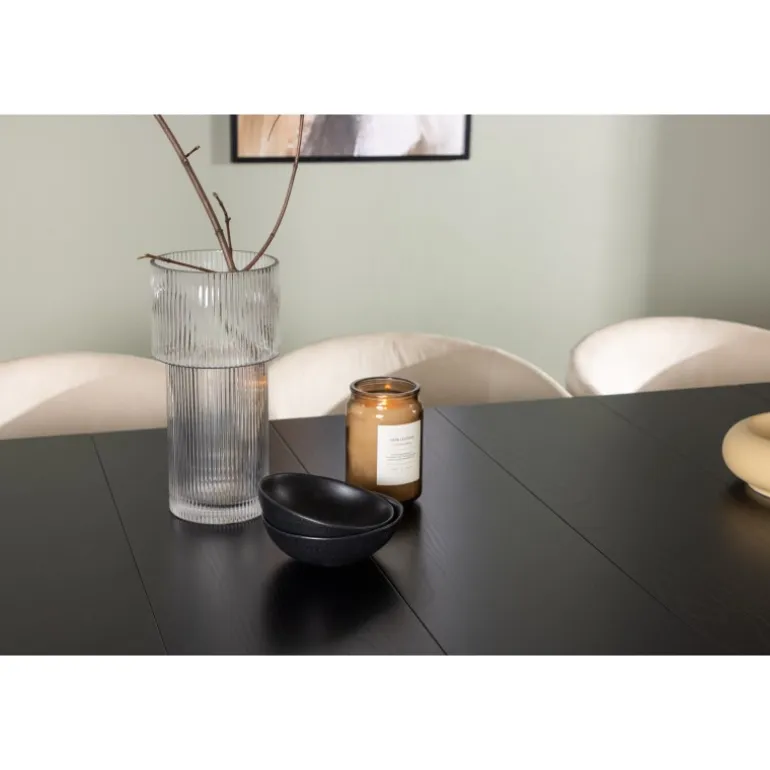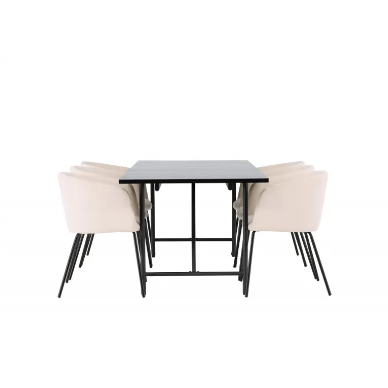 Et sort Spisebordssæt i skandinavisk design, der udstråler minimalisme, modebevidsthed, og modernitet! Dette smukke sorte spisebord, Astrid, vil være kronjuvelen i din indretning. Astrid spisebord imponerer med sin tynde bordplade i en elegant mat sort nuance. Lavet af MDF med finer, tilføjer det et sofistikeret touch til din spisestue. Basen er slank i sort metal, hvilket skaber en luftig atmosfære i rummet. Bordet måler 200×75 cm. For at komplementere dit spisebord, har vi også matchet det med sorte spisebordsstole fra Berit-serien. Disse stole har et slankt og moderne design med en let afrundet ryg og en komfortabel sædepolstring i velour og polyester-linned. Med deres slanke sorte jernben skaber de et sammenhængende helhedsindtryk sammen med bordets minimalistiske ramme. Dette Spisebordssæt er ikke kun en visuel perle, men tilbyder også et komfortabelt og funktionelt rum til middage og sociale sammenkomster. Skab en unik atmosfære i dit hjem og nyd hvert måltid i stil og komfort!