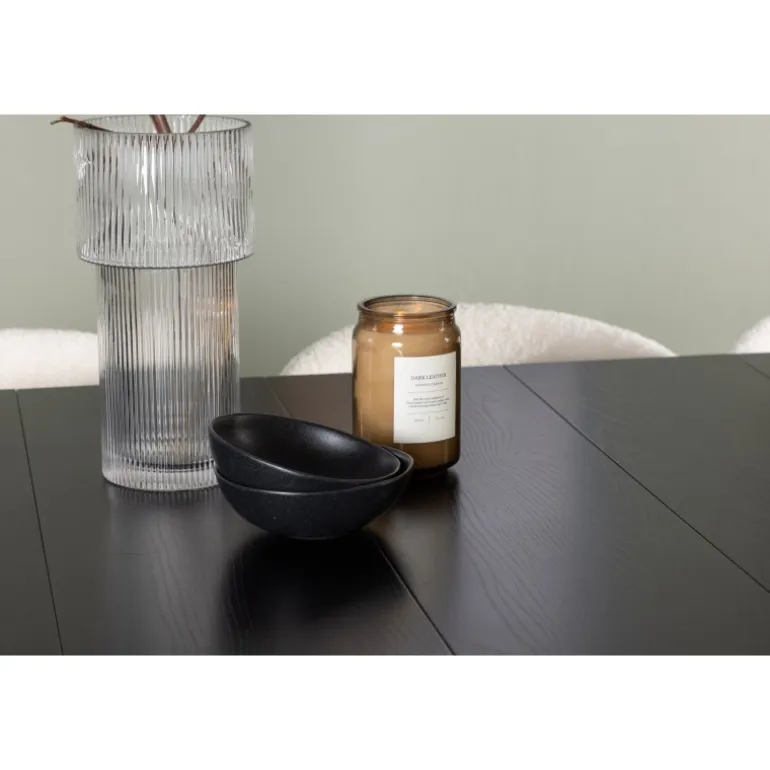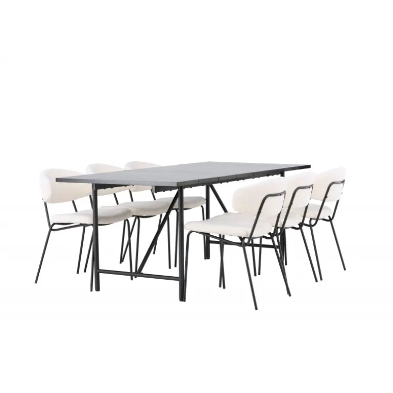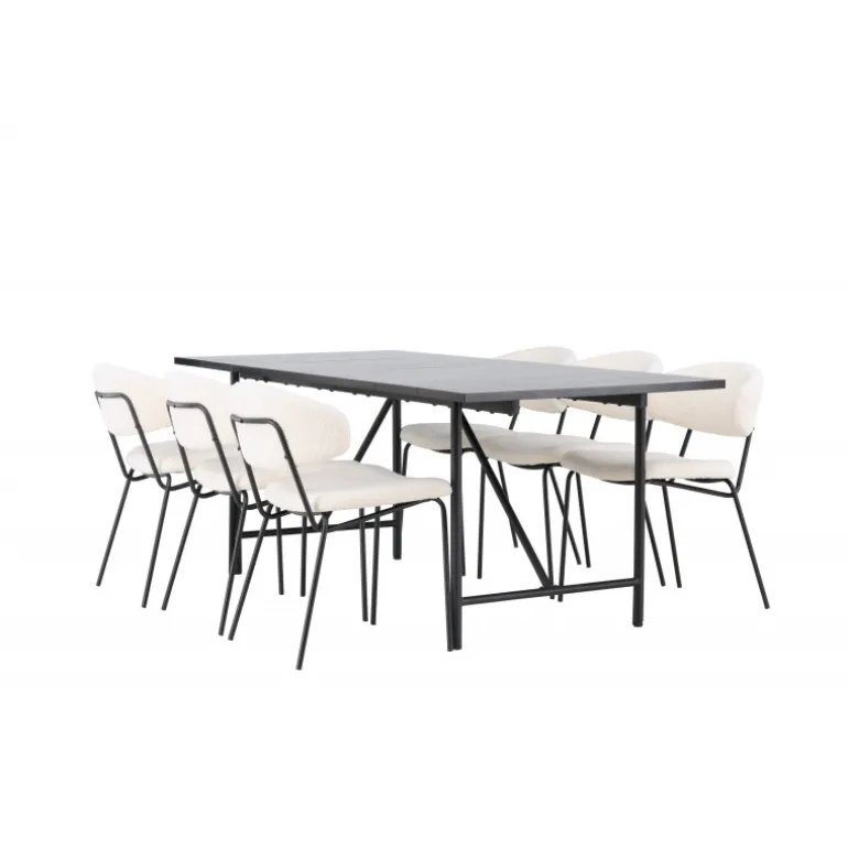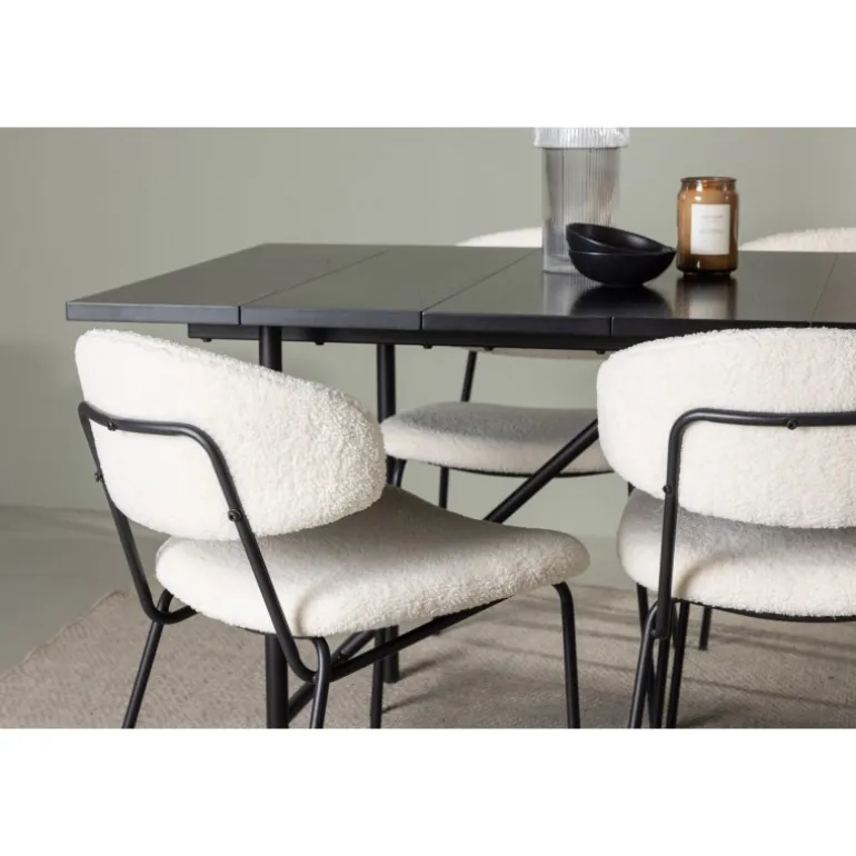 Opgrader dit hjem med stil og elegance med dette skandinaviske Spisebordssæt i et slankt design! Vores rektangulære sorte spisebord Astrid er det perfekte valg til at skabe en moderne og sofistikeret atmosfære i dit hjem. Den matte sorte MDF-bordplade med finer giver en tynd og elegant fornemmelse, mens den tilføjer et strejf af luksus. Den slanke base giver en luftig fornemmelse og åbner rummet op, hvilket skaber en indbydende atmosfære til middage og sociale sammenkomster. Bordets dimensioner: 200×75 cm. Her har vi suppleret spisebordet med de iøjnefaldende stole fra Chico-serien. Denne stol kombinerer minimalistisk stil med et rundet og slankt design. Bouclé-stoffet i en smuk beige farve udstråler en følelse af luksus og komfort. Sædet og ryglænet er polstret for ekstra komfort under lange middage og hyggelige samtaler. Den sorte stålkonstruktion er ikke kun trendy, men giver også stabilitet og holdbarhed. Kort sagt, det er et perfekt design.