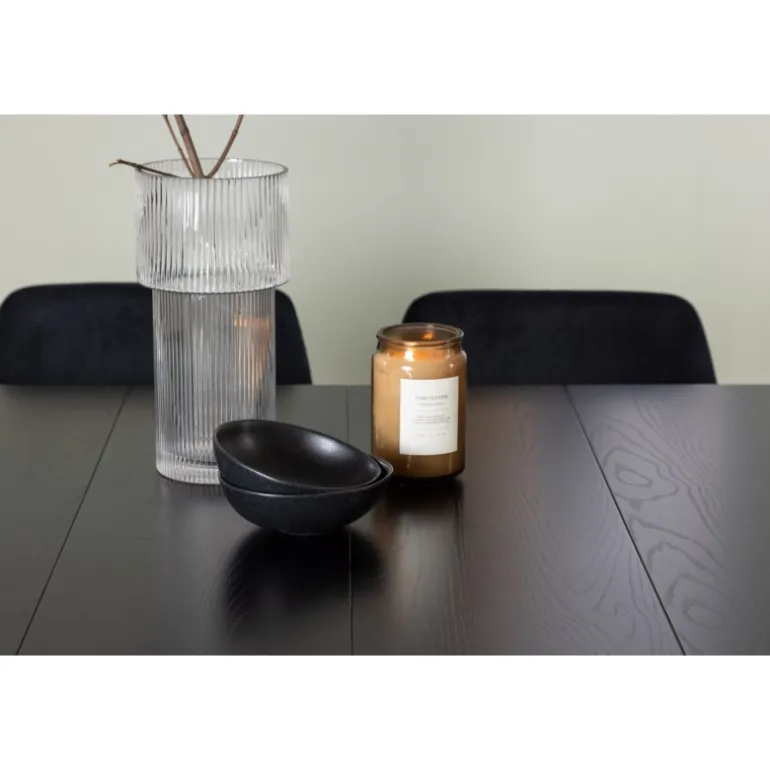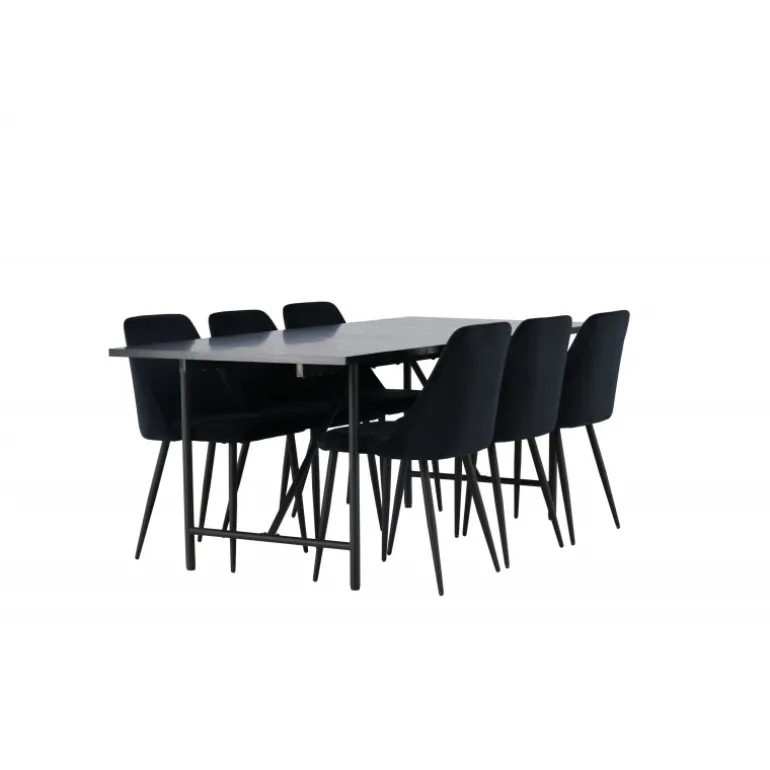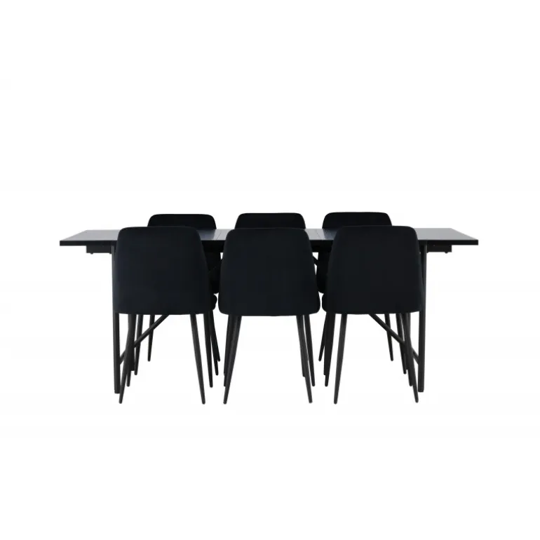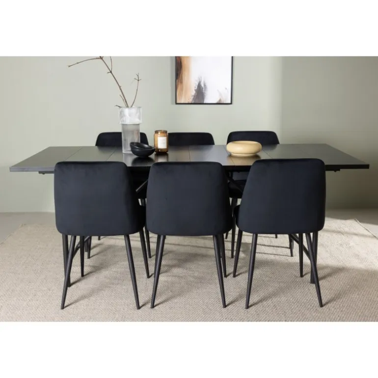 Skab et moderne, minimalistisk og modebevidst fokuspunkt i din stue med et stort, sort spisebordssæt, der udstråler gennemtænkt design og høj komfort! Vores rektangulære spisebord Astrid er perfekt til at skabe en indbydende atmosfære i dit spiseområde. Bordpladen er lavet af tynd MDF med finér i en mat sort nuance, hvilket giver et sofistikeret touch til dit interiør. Bordets slanke design med sin smalle base giver også en følelse af plads og åbner rummet op. Bordmål: 200x75cm. Til spisebordet har vi matchet vores sorte spisestuestole fra Night-serien, som kombinerer komfort med elegant elegance. Stolens sæde er fuldt polstret i sort fløjlstof, og stolens ben matcher i en stilfuld sort nuance. Med sin komfortable og luksuriøse fornemmelse er Night spisestuestolen den perfekte ledsager til Astrid spisebordet. Lad dette spisebordssæt være prikken over i’et i dit hjem. Skab en indbydende atmosfære, hvor du og dine gæster kan nyde vidunderlige øjeblikke sammen!