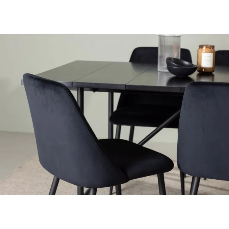 - Komfortable stole: Fuldt polstrede stole i sort fløjlstof for ekstra komfort.