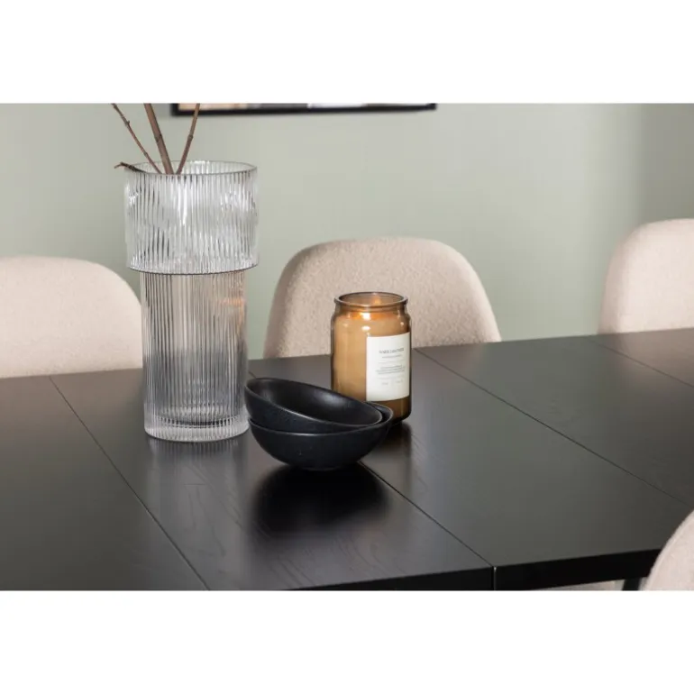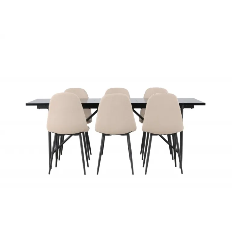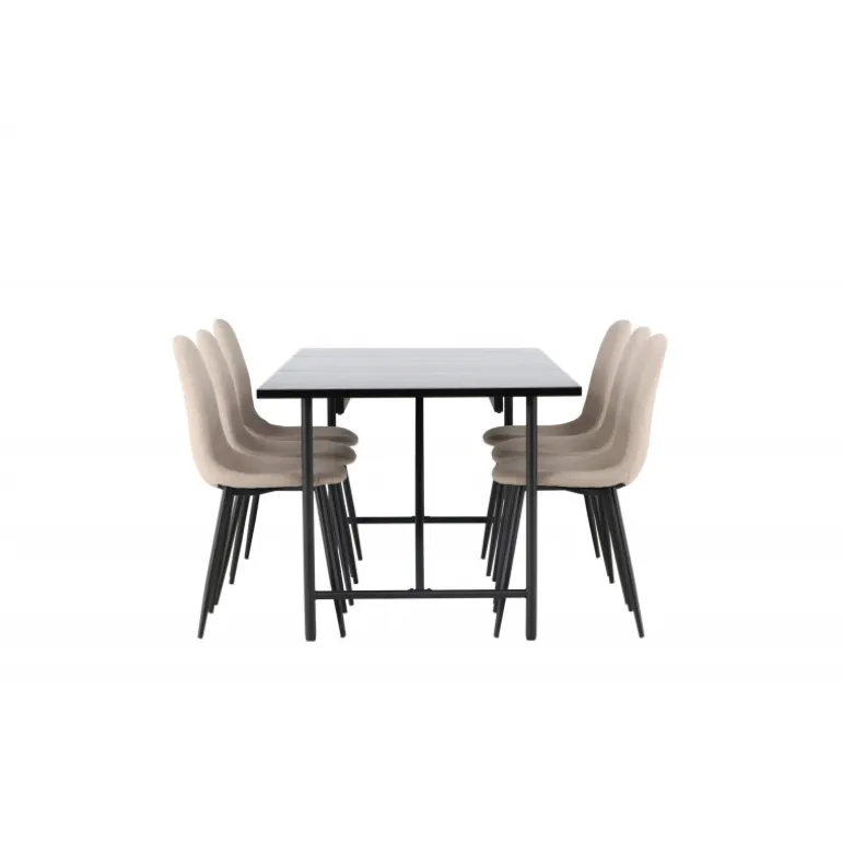 Giv dit hjem en stilfuld opgradering med dette minimalistiske Spisebordssæt i moderne stil! Dette smukke sorte spisebord, Astrid, vil blive centrum for dit interiørdesign. Astrid spisebordet imponerer med sin slanke bordplade i en elegant mat sort nuance. Lavet af MDF med finer, tilføjer det et sofistikeret touch til din spisestue. Basen er slank i sort metal, hvilket skaber en luftig atmosfære i rummet. Bordet måler 200×75 cm. For at komplementere dit spisebord, har vi også matchet det med beige stole fra Berit-serien. Disse stole har et rent og moderne design med en let buet ryg og et komfortabelt sæde polstret i fløjlsstof og polyesterlinned. Med deres slanke sorte jernben passer de perfekt til spisebordets sorte farve. Dette Spisebordssæt er ikke kun en visuel perle, men tilbyder også en komfortabel og funktionel plads til middage og sociale sammenkomster. Skab en unik atmosfære i dit hjem og nyd hvert måltid i stil og komfort!