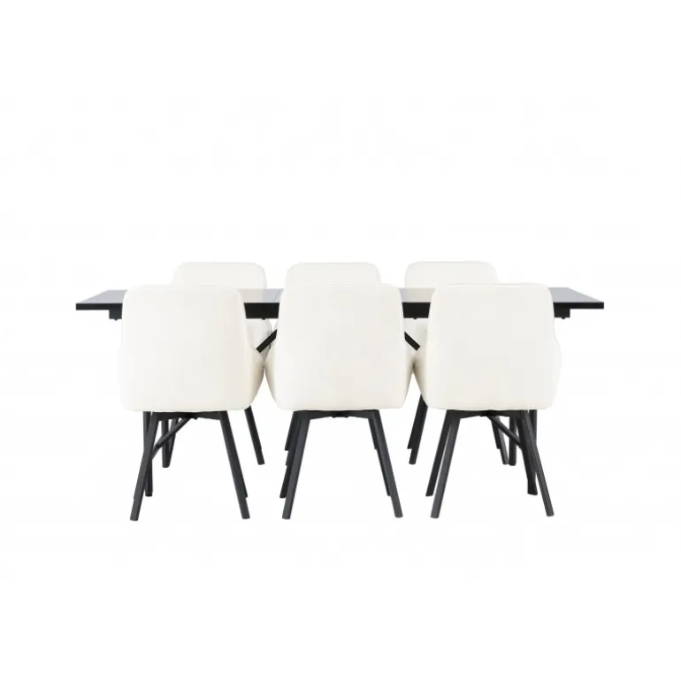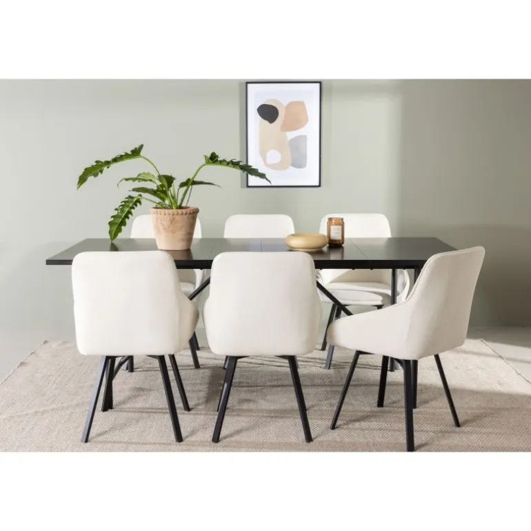 Et elegant spisebordssæt designet i overensstemmelse med de nyeste trends inden for farver og former! Vores sorte minimalistiske spisebord, Astrid, har en tynd, mat sort MDF-bordplade med finer, der tilføjer et sofistikeret touch til din indretningsstil. Den slanke og luftige design af basen skaber en åben atmosfære i rummet, hvilket gør det perfekt til at skabe en indbydende og stilfuld spiseplads. Derudover sikrer dens generøse størrelse, at alle har nok plads uden at føle sig trange. Bordets dimensioner er 200×75 cm. Sammen med de beige stole fra Rosie-serien bliver dette spisebordssæt komplet. Disse skandinaviske designstole er både trendy og komfortable. Den fuldt polstrede beige stofsæde og de sorte, elegante metalben med let flarede former tilføjer et moderne touch til din indretning. Med de integrerede armlæn kan du nyde et afslappet måltid, mens du opretholder en elegant stil. Lad Astrid-spisebordet og Rosie-stolene tage din spiseoplevelse til et nyt niveau af stil og komfort. Skab et sted, hvor familie og venner kan samles for at nyde god mad og skabe minder sammen!
