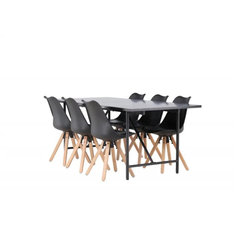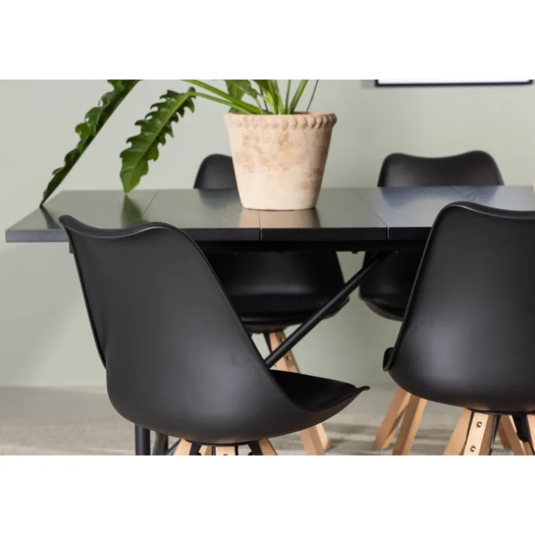 Indret personligt og moderigtigt med et Spisebordssæt i konsistent sort farve, der er let at matche med andre interiørdesigns og virkelig sætter tonen i stuen med sit storslåede design! Vores sorte spisebord Astrid er perfekt for dem, der elsker minimalistisk og moderne stil. Den slanke, matte sorte bordplade er rektangulær i MDF med finer, hvilket skaber en elegant atmosfære i rummet. Takket være den slanke og luftige base giver Astrid også en åben fornemmelse i rummet. Bordets dimensioner er 200x75cm. Her i en vidunderlig kombination med vores sorte spisestole Zeno. Det indbydende design med sort plast og indbygget sædehynde tilbyder vidunderlig komfort under måltider, og de udspredte træben giver stor stabilitet. Nyd bekvemmeligheden og stilen af dette indbydende Spisebordssæt i skandinavisk stil!