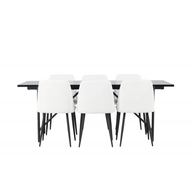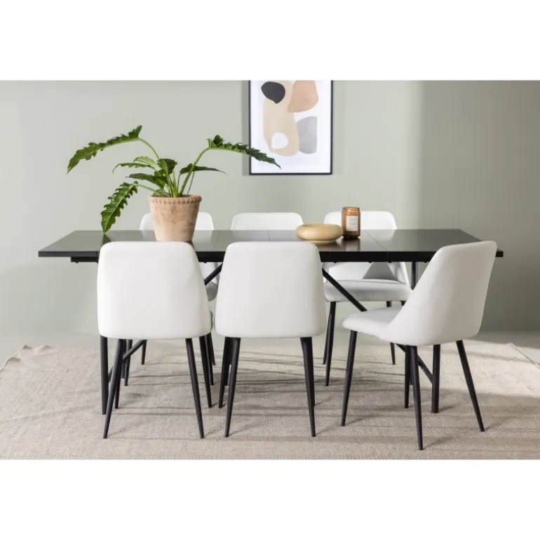 Med dette Spisebordssæt får du et moderne, minimalistisk og modebevidst fokuspunkt i din stue, der udstråler gennemtænkt design og høj komfort! Vores rektangulære spisebord, Astrid, er perfekt til at skabe en indbydende atmosfære i din spisestue. Bordpladen er lavet af tynd MDF med finer i en mat sort nuance, hvilket tilføjer en sofistikeret touch til dit interiør. Bordets slanke design med sin smalle base skaber også en følelse af rum og åbner rummet op. Bordets dimensioner: 200x75cm. Til spisebordet har vi parret det med vores hvide stole fra Night-serien, der kombinerer komfort med elegant enkelthed. Stolesædet er fuldt polstret i hvidt PU-læder, og stolebenene matcher bordet i en stilfuld sort nuance. Med sin komfortable og luksuriøse følelse er Night-stolen den perfekte ledsager til Astrid spisebordet. Lad dette Spisebordssæt være den afsluttende touch i dit hjem. Skab en indbydende atmosfære, hvor du og dine gæster kan nyde dejlige stunder sammen!