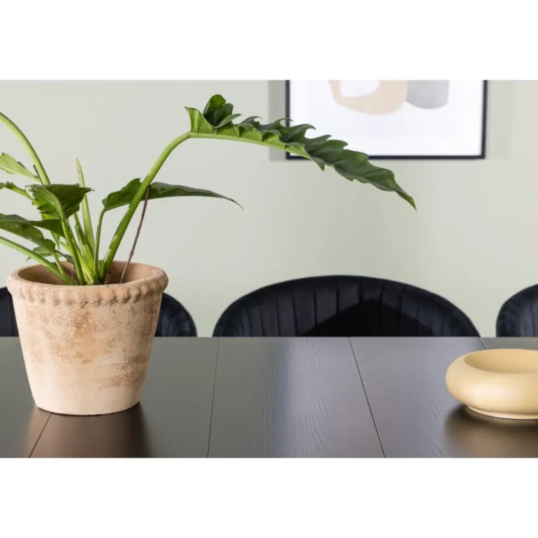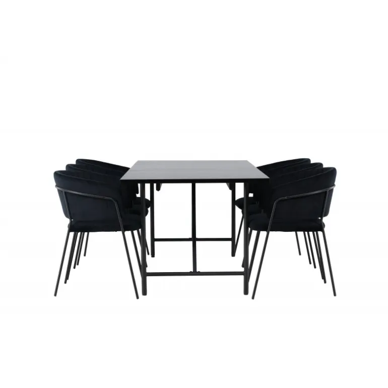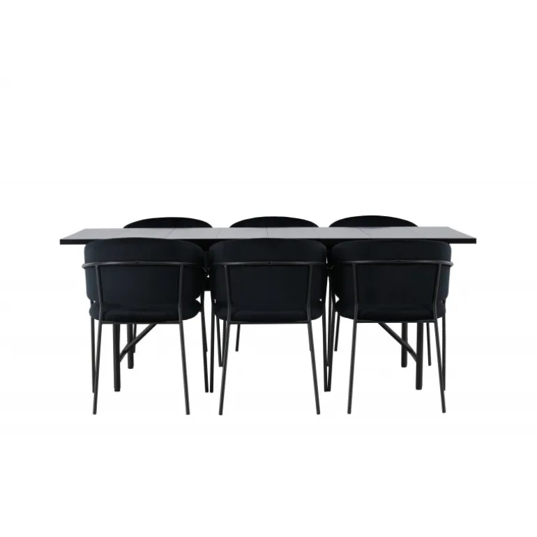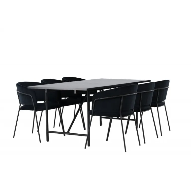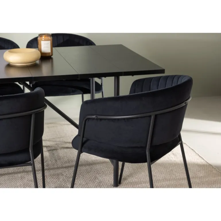 Et sort Spisebordssæt, der har et moderne udtryk og kombinerer stil med komfort på den bedst mulige måde – her kan du sidde længe sammen med dine kære! Vores smukke spisebord Astrid vil virkelig tage din indretning til det næste niveau. Med sin rektangulære, slanke, matte sorte MDF-top med finer, bringer Astrid en sofistikeret følelse til dit rum. Basen er slank og skaber hurtigt en luftig atmosfære, der åbner rummet op. Desuden er størrelsen generøs og rummer både familie og venner. Bordets dimensioner er 200×75 cm. For at fuldende Spisebordssættet har vi parret det med de sorte stole Selma. Ryglænet er let buet for optimal komfort, og sædet er polstret i luksuriøst fløjlstof med dekorative sømme, der tilføjer et ekstra strejf af elegance. Stolbenene er slanke og lavet af sort stål, hvilket giver en moderne og stilfuld kontrast til det bløde fløjlstof. Det bliver ikke mere komfortabelt end dette! Her får du et præ-komponeret Spisebordssæt, der er gennemtænkt og let at matche med din personlige indretningsstil!