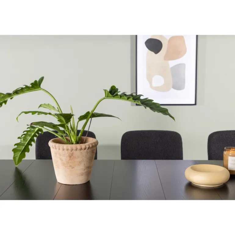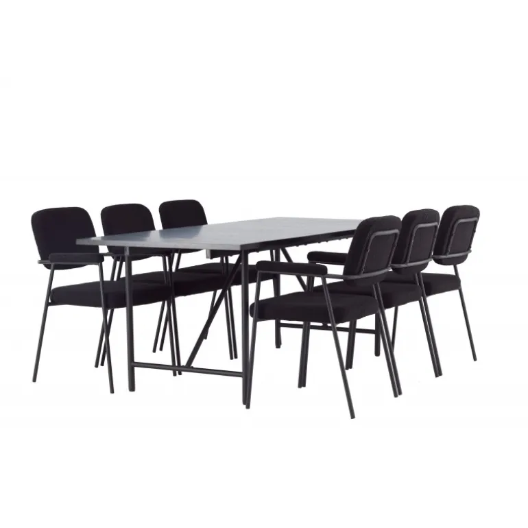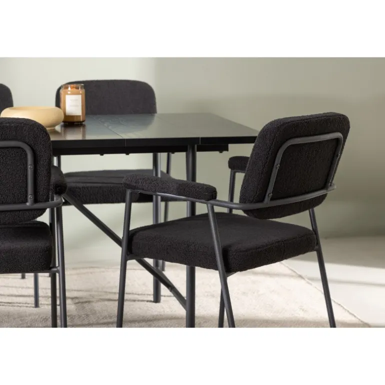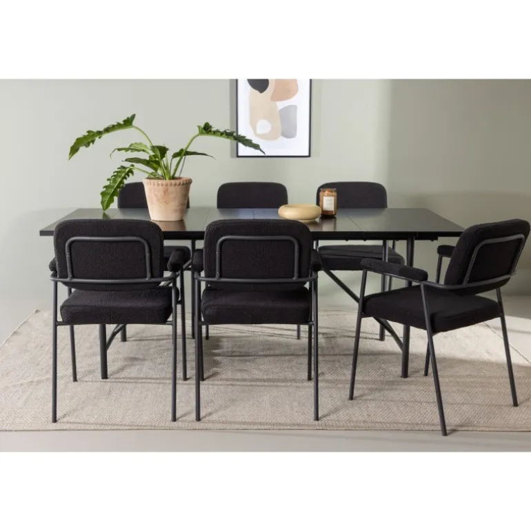 Et stilfuldt Spisebordssæt, der er designet helt i tråd med de nyeste trends inden for materialer og former! Med det smukke spisebord Astrid får du en sofistikeret og stilfuld atmosfære i din spisestue. Bordpladen i tynd mat sort MDF med finer tilføjer et elegant touch til rummet, og den slanke design af basen giver en luftig følelse, der åbner op for rummet. Det er et perfekt valg for dem, der ønsker en minimalistisk og samtidig stilfuld indretning, der kan rumme mange. Bordets dimensioner: 200x75cm. Her har vi matchet det sorte spisebord med de bløde Yesterday spiseborde. Denne elegante stol i skandinavisk design har et fuldt polstret sæde i sort bouclé stof og smalle stoleben med integrerede armlæn i sort metal. Det bløde sæde er polstret for ekstra komfort og inviterer til lange hyggelige middagsselskaber. Sæt tonen i stuen med et sort Spisebordssæt i skandinavisk stil, der udstråler minimalisme og modernitet på bedste vis!