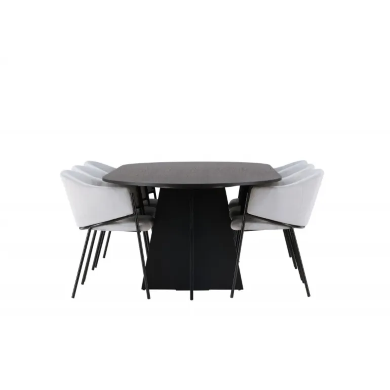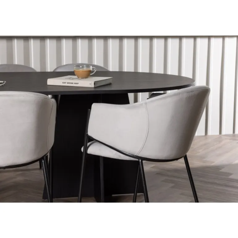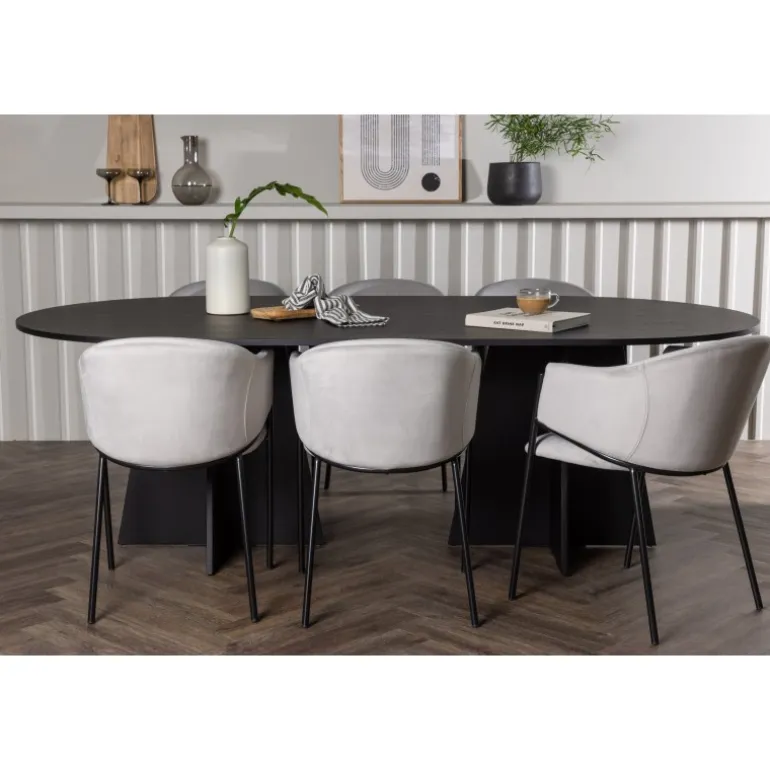 Indret hjertet af dit hjem indbydende, storslået og komfortabelt med dette charmerende spisebordssæt i skandinavisk stil! Vores ovale spisebord fra Bootcut-serien sætter hurtigt tonen i stuen. Den ovale bordplade af sort fineret MDF tilføjer et sofistikeret og moderne touch til dit hjem. Den slanke top skaber et raffineret indtryk og giver en smagfuld kontrast til den robuste og karakteristiske base. Med to buede ben i et åbent design bliver dette spisebord virkelig en elegant og stilfuld tilføjelse til dit rum. Her har vi parret det med vores vidunderlige og slanke spisestole fra Evelina-serien. Disse stole bringer en moderne fornemmelse til din spisestue, samtidig med at de tilbyder en dejlig komfort. Med deres fuldt polstrede sæder og afrundede ryglæn i lysegråt fløjlstof bliver hver siddeplads en luksuriøs oplevelse. Den minimalistiske sorte stålramme giver stolene et elegant touch til det samlede look. Med dette spisebordssæt får du en kombination af luksus og stil. Det giver dig muligheden for at holde festlige middage i fremtiden, hvor dine gæster vil føle sig velkomne og afslappede.