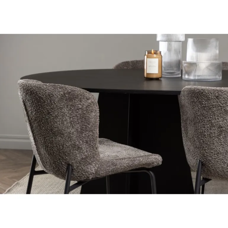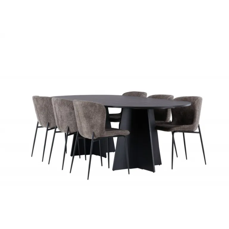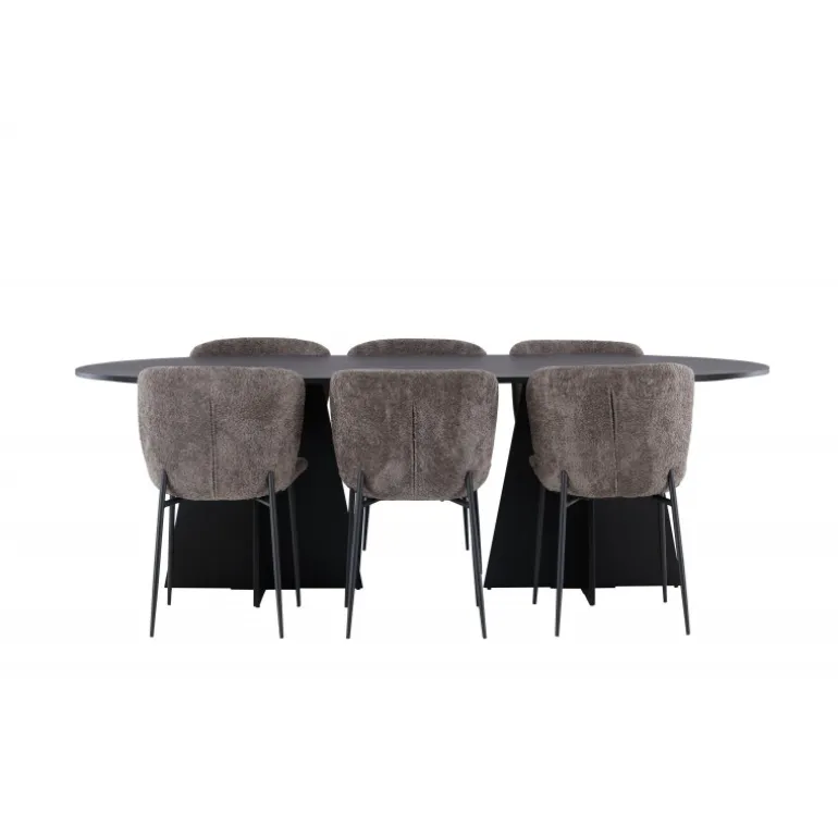 Hvad mere kan du ønske dig end et Spisebordssæt med alle de rigtige funktioner? Vores ovale spisebord Bootcut har et unikt design med en oval bordplade i sort MDF med finer og en karakteristisk ramme med to kegleformede ben i åbent design. Her sammen med modebevidste spisebordsstole fra Modesto-serien. Stolen er fuldt polstret i beige shaggy stof med stilfulde smalle stoleben i sort metal. Den let afrundede ryg og polstrede sædehynde giver ekstra komfort. Her kombineres bløde former med trendy design! Bordmål: 230x115cm.