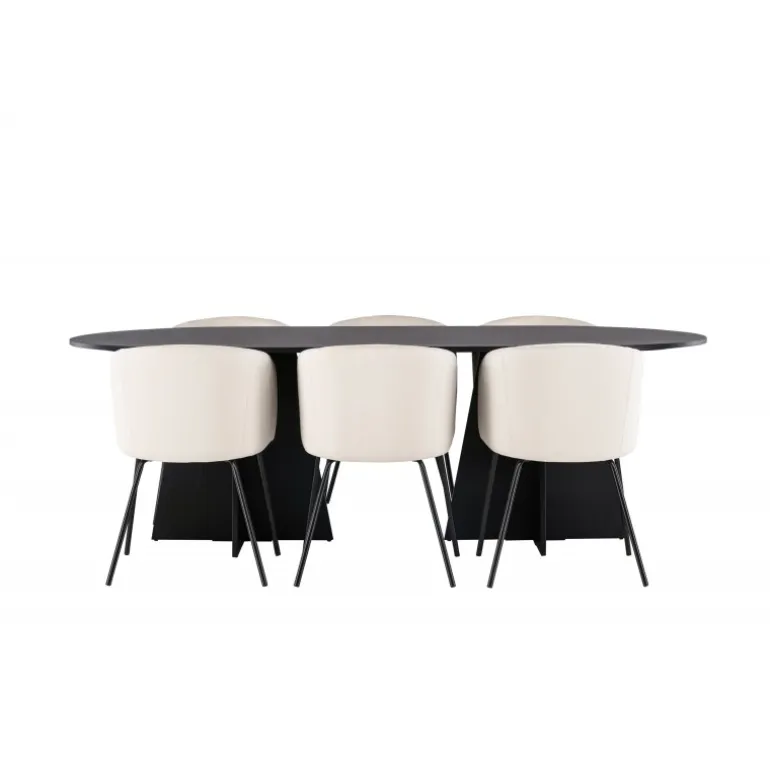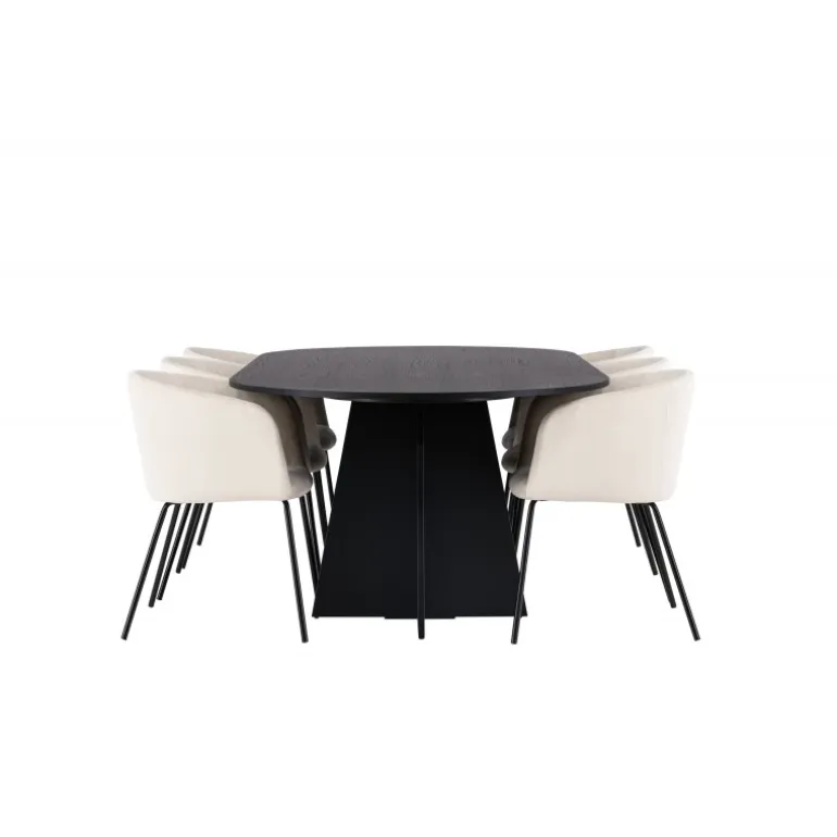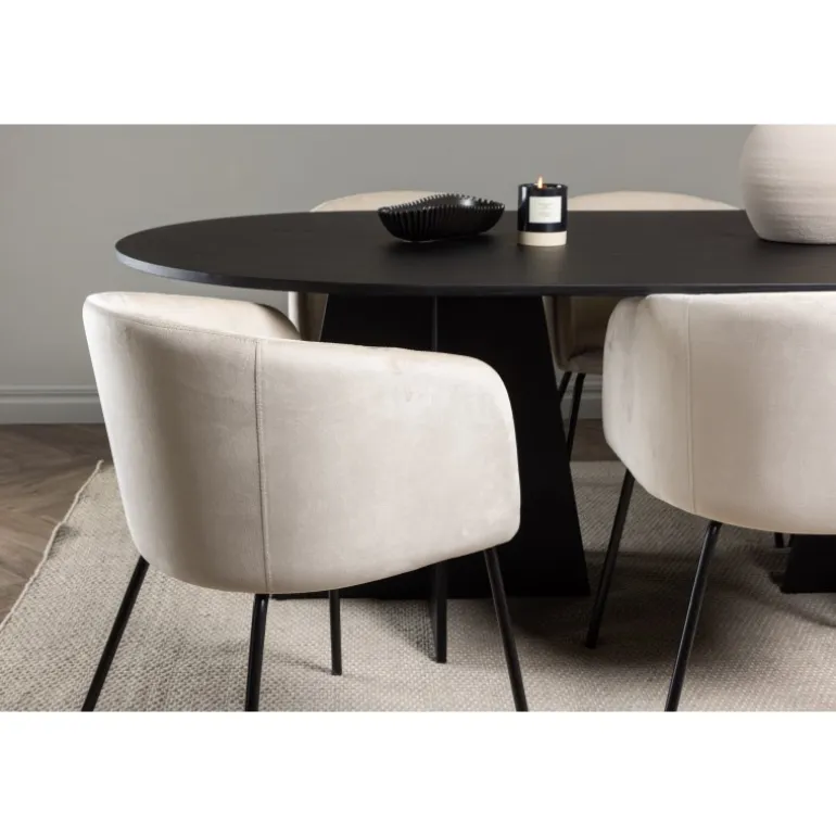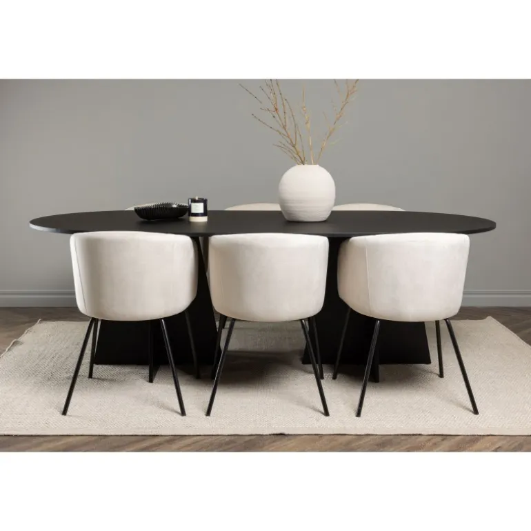 Tilføj glans til din indretning! Vores ovale spisebord Bootcut har et unikt design med en oval bordplade i sort MDF med finer og en karakteristisk ramme med to kegleformede ben i åben design. Her sammen med vores fornemme spisebordsstole Berit. Stolen har et fuldt polstret design med en let afrundet ryg og sæde i velourstof og smalle ben i sort jern. Den fløjlsagtige blikfang er prikken over i’et her! Bordmål: 230×115 cm.