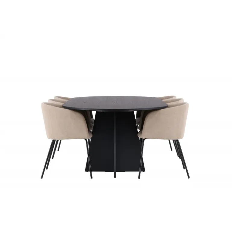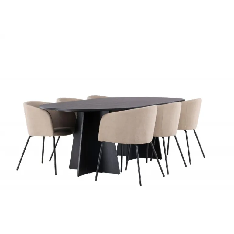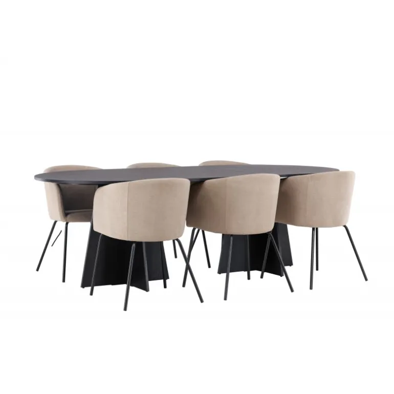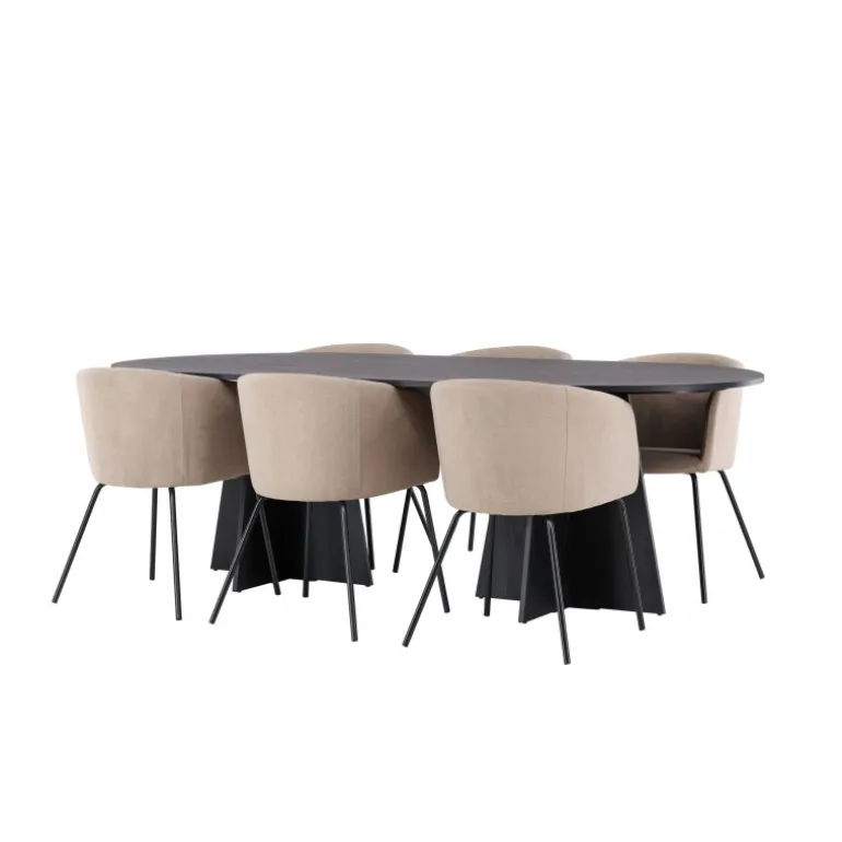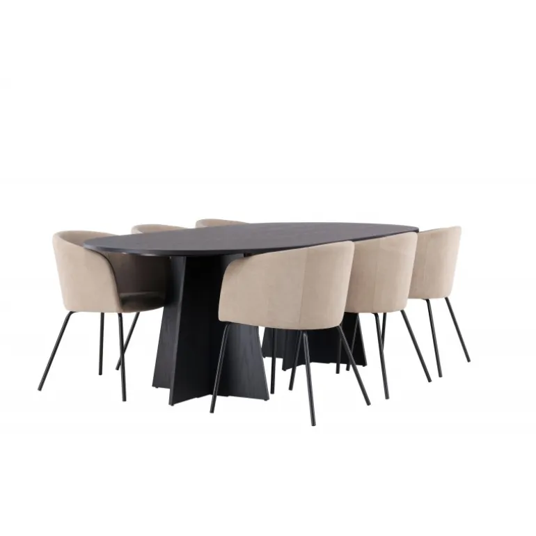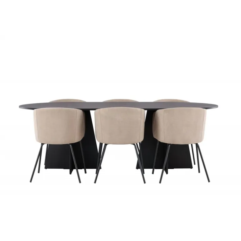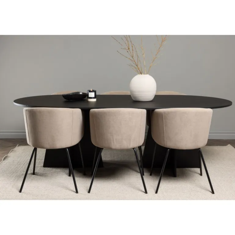 Det bliver ikke bedre end dette! Vores ovale spisebord Bootcut har et unikt design med en oval bordplade i sort MDF med finer og en karakteristisk ramme med to kegleformede ben i åben design. Her sammen med vores komfortable spisestole Berit. Stolen har et fuldt polstret design med en let afrundet ryg og sæde i fløjlsstof og polyesterlinned samt smalle stoleben i sort jern. Simpelthen en utrolig indbydende og luksuriøs Spisebordssæt! Bordmål: 230×115 cm.