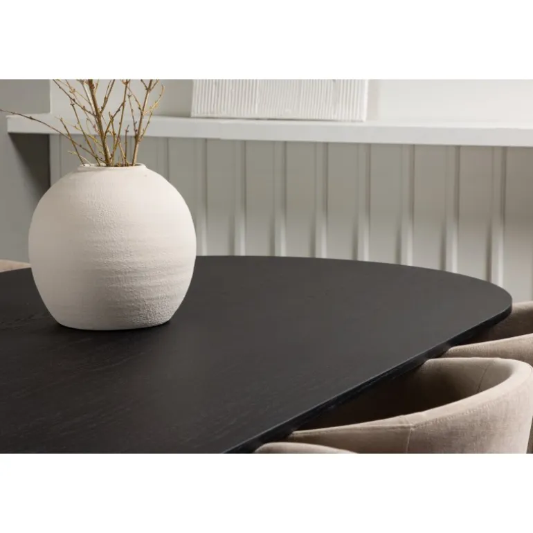 - Unikt design: Oval bordplade i sort MDF med finer og kegleformede ben.