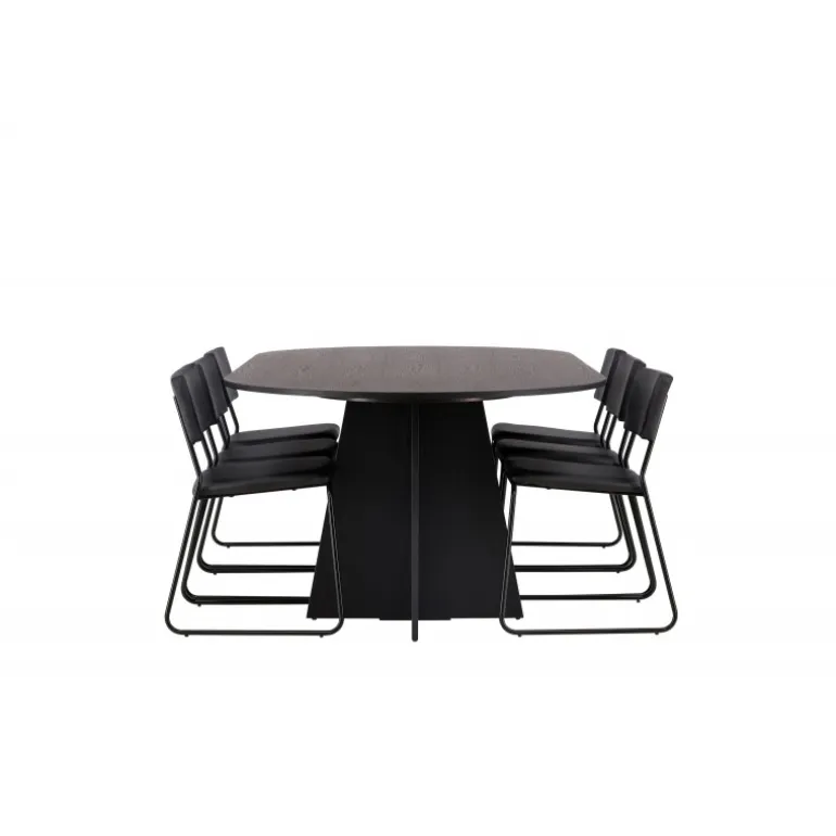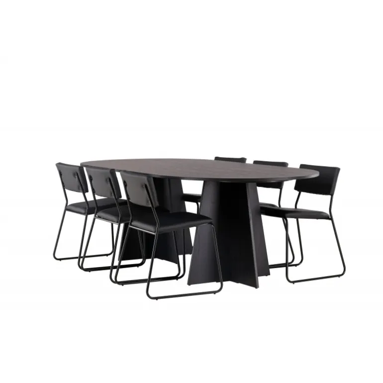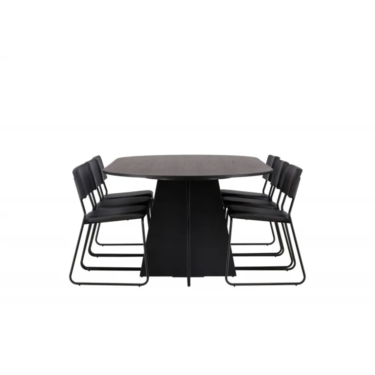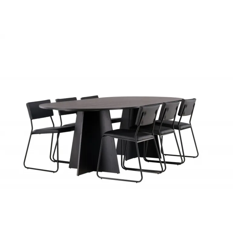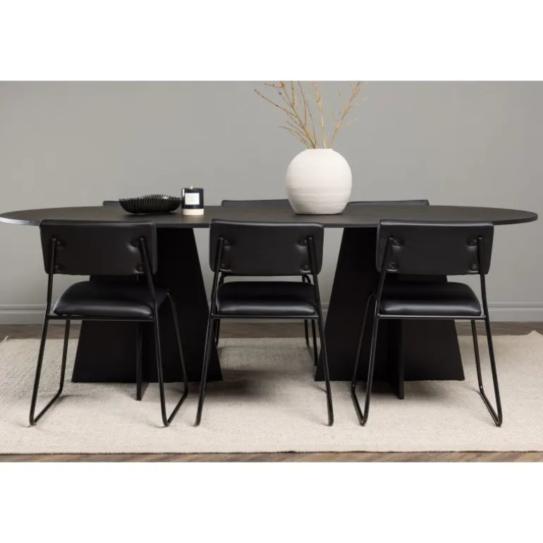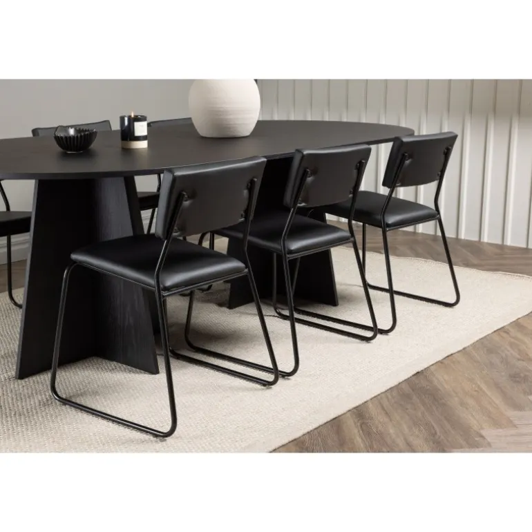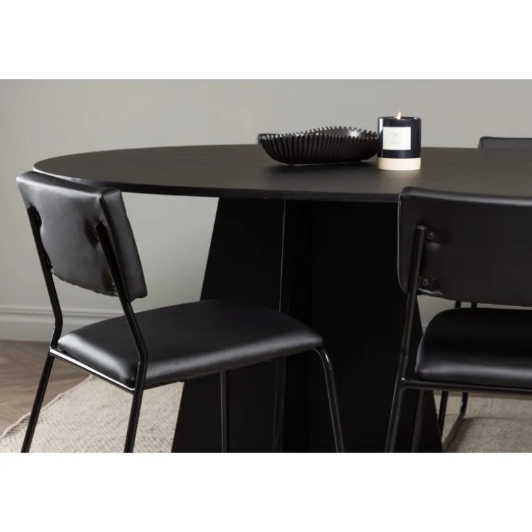 Her ender ingen på kanten! Vores ovale spisebord Bootcut har et unikt design med en oval bordplade i sort MDF med finer og en karakteristisk ramme med to kegleformede ben i åben design. Her sammen med vores sorte spisebordsstole fra serien Kenth. Det minimalistiske, moderne design skaber en luftig fornemmelse. Stolen har en ryg og sæde i sort polyurethan læder og polyester samt dekorative smalle ben i jern. Et frækt Spisebordssæt i moderne design! Bordets dimensioner: 230×115 cm.