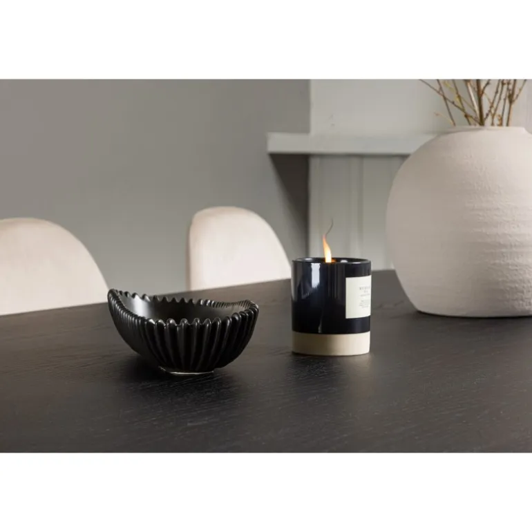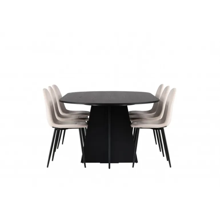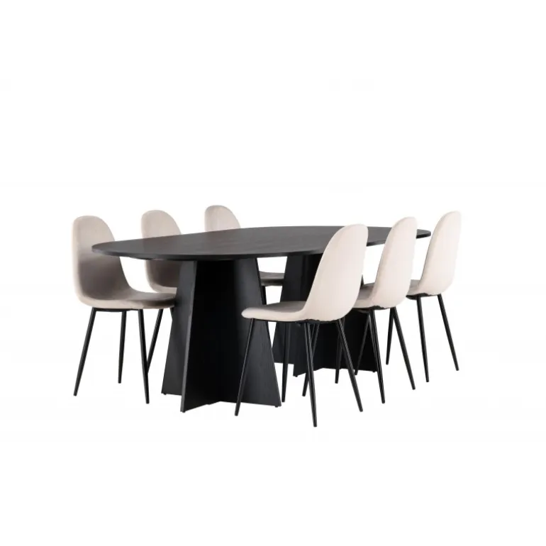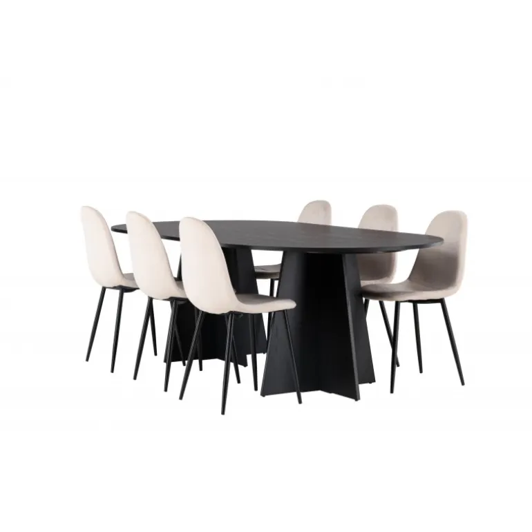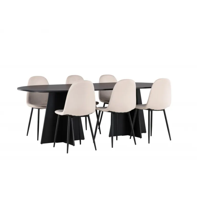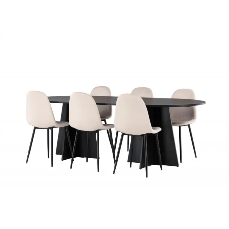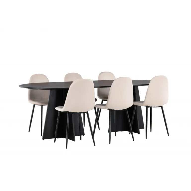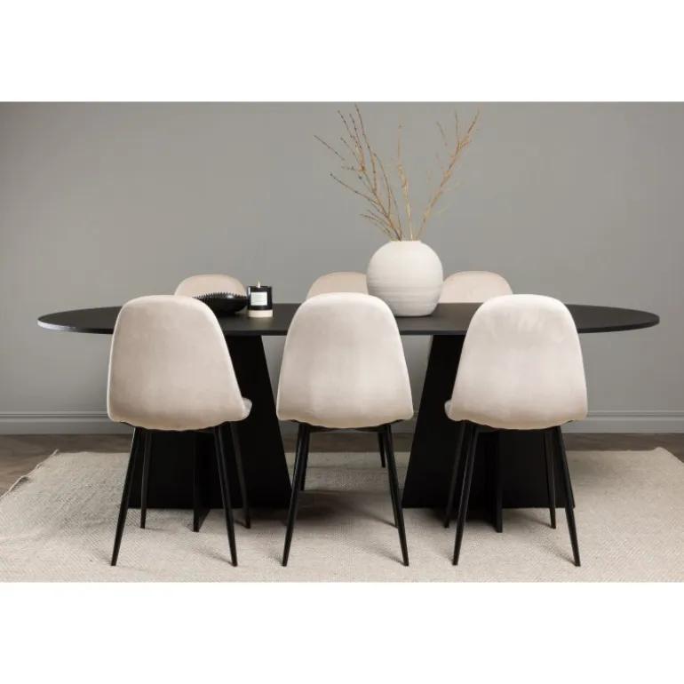 Glødende og sodet på samme tid! Vores ovale spisebord Bootcut har et unikt design med en oval bordplade i sort MDF med finer og en markant ramme med to kegleformede ben i åben design. Sammen med vores vidunderlige spisestole Polar. Denne spisestol i et fuldt polstret design med en let afrundet ryg og sæde i velourstof samt ben i sort pulverlakeret metal er lige så komfortabel, som den er iøjnefaldende. Indret stuen smart og tidløst! Bordmål: 230×115 cm.