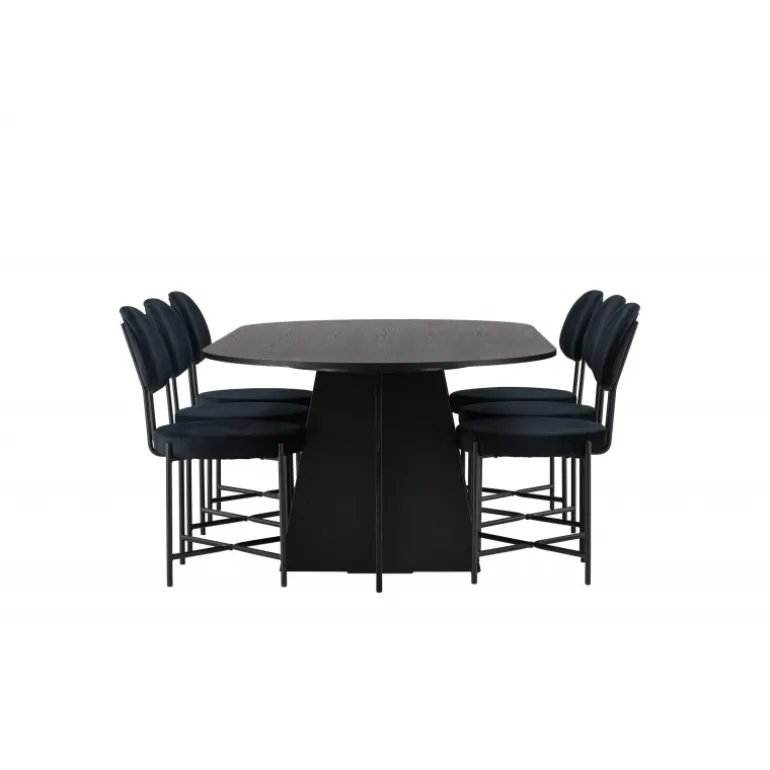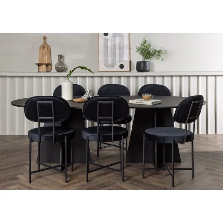 Et konsekvent sort Spisebordssæt i stor stil vil uden tvivl give dit interiør et stilfuldt løft og øge komforten ved dine måltider i fremtiden! Vores ovale spisebord fra Bootcut-serien praler af et imponerende og robust design. Den ovale bordplade, lavet af sort MDF med finer, er en perfekt blanding af modernitet og tradition. Dens slanke profil skaber et minimalistisk indtryk og giver en smagfuld kontrast til den robuste ramme med dens to buede ben i et åbent design. Bordmål: 115×230 cm. Her parret med vores fantastiske stole fra Stella-serien. Denne stol er ikke kun en fryd for øjet, men også utroligt komfortabel. Med sit trendy og skandinaviske design tilføjer det afrundede sæde og ryglæn i sort velourstof et strejf af luksus og elegance. De minimalistiske sorte stålben på stolen komplementerer perfekt det moderne æstetiske og skaber en afbalanceret harmoni i rummet. Skab den perfekte kombination i hjertet af dit hjem og indret det indbydende, luksuriøst og komfortabelt i fremtiden!