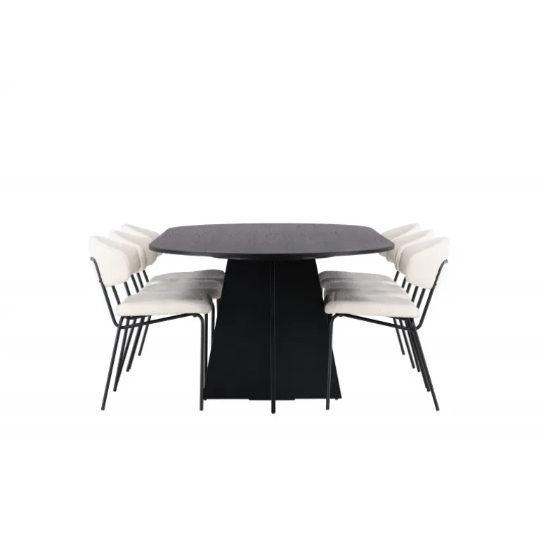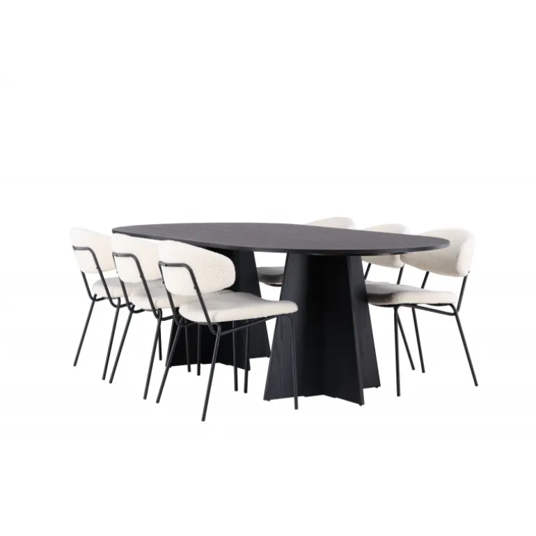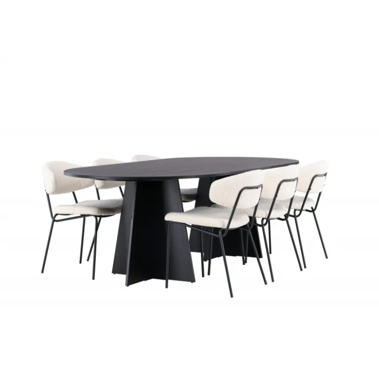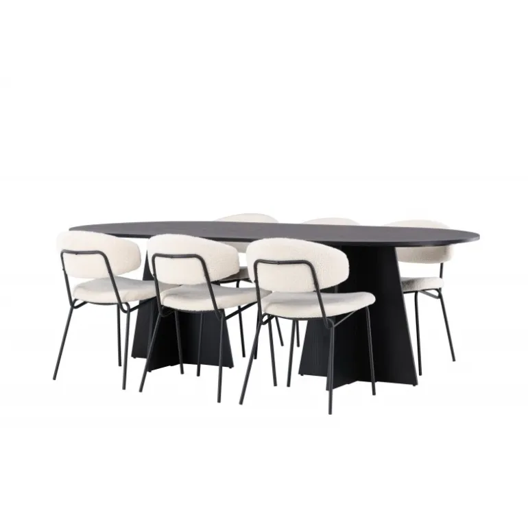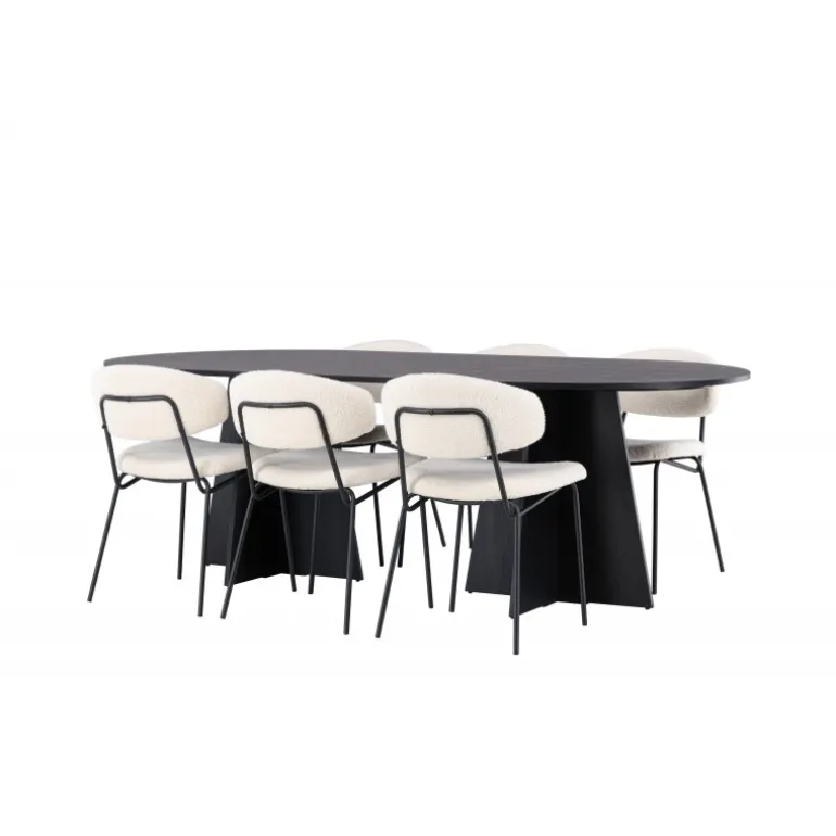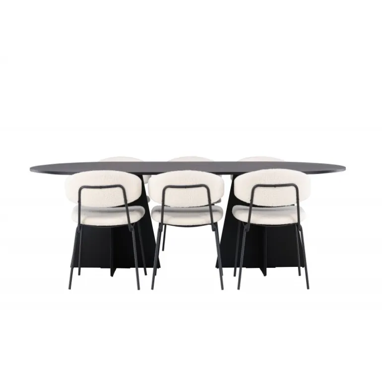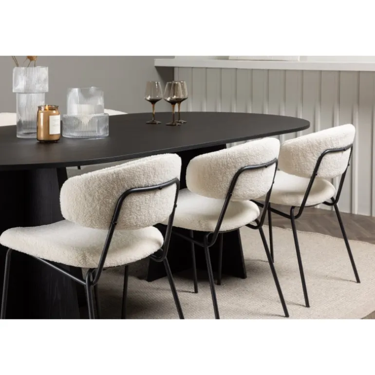 Lad det fluffy og minimalistiske møde det robuste! Vores ovale spisebord Bootcut har et unikt design med en oval bordplade i sort MDF med finer og en karakteristisk ramme med to kegleformede ben i åben design. Her i stilfuld kombination med vores hvide spisestole fra Chico-serien. Stolen er i hvid bouclé stof med polstret sæde og ryglæn for ekstra komfort. Benene er smalle i sort stål, hvilket giver stolen en luftig følelse. En vidunderlig kombination, der er helt i tråd med de nuværende trends! Borddimensioner: 230×115 cm.