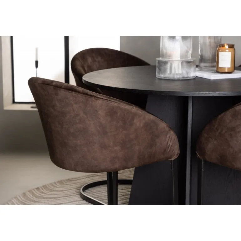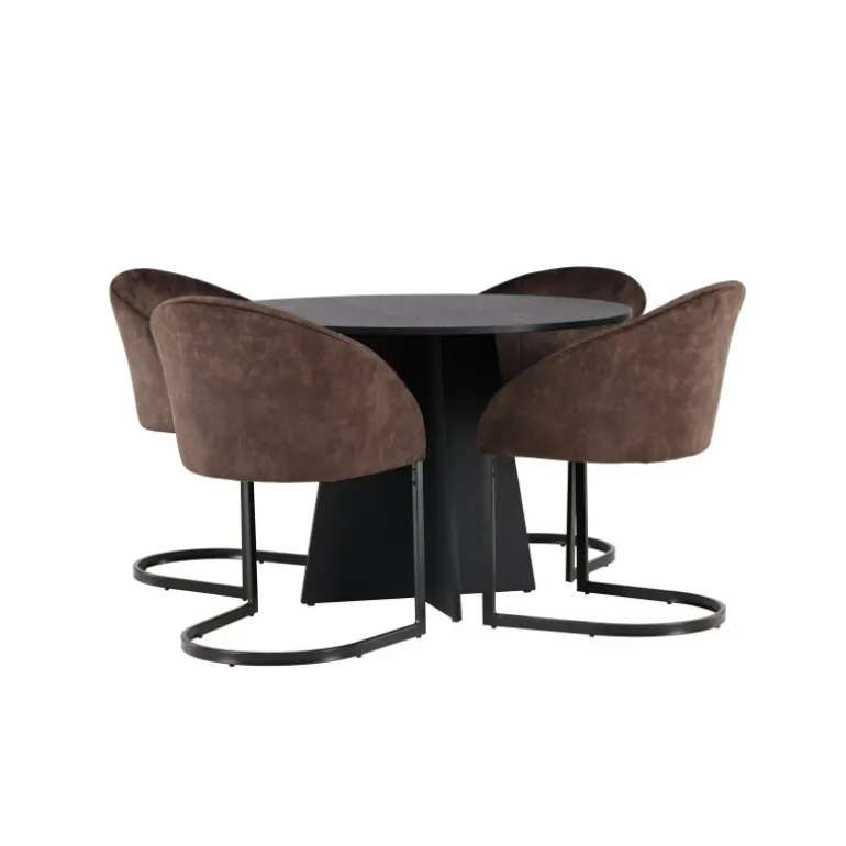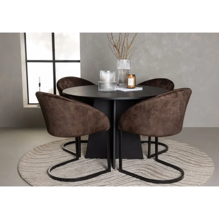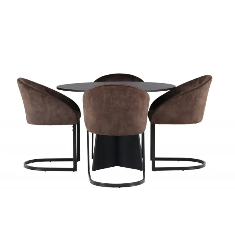 Skab en følelse af fællesskab i dit hjem med et rundt spisebordssæt, der udstråler komfort og stil på en perfekt måde! Vores runde spisebord, Bootcut, har et velkendt design. Den sorte farve tilføjer et sofistikeret touch, mens MDF-bordpladen med finer fremhæver dens naturlige skønhed. Bordet har en designrig base, der giver stabilitet og tilføjer et flot touch til det overordnede udseende. Bordets dimensioner er 110 cm. Her, i en vidunderlig kombination, er vores brune spisestole fra Evening-serien, der tager din komfort til et nyt niveau. Med en nostalgisk charme og slank elegance bliver disse stole et luksuriøst omdrejningspunkt ved spisebordet. Det fuldt polstrede sæde og den buede ryglæn i brunt stof skaber en hyggelig følelse, mens det minimalistiske benstel i mat brunt stål tilføjer et moderne twist. Med dette spisebordssæt kan du skabe mindeværdige øjeblikke med familie og venner. Føl en følelse af sammenhold, når I samles omkring dette smukke bord og nyd sikkerheden ved, at ingen risikerer at ende ude på kanten!