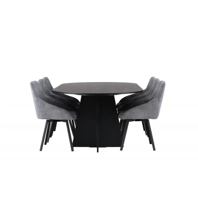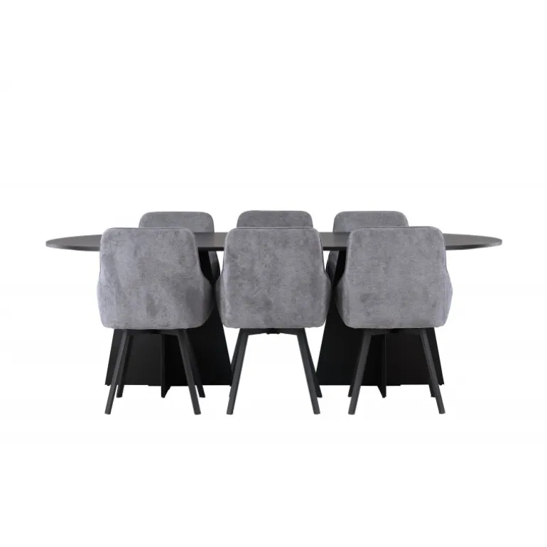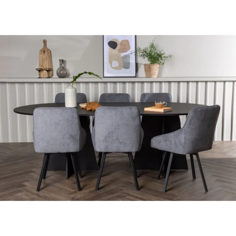 Indret hjemmets hjerte indbydende, robust og stilfuldt med dette Spisebordssæt i skandinavisk stil! Med vores ovale spisebord Bootcut får du et imponerende midtpunkt, hvor du kan samle dine kære omkring. Den sorte MDF-bordplade med finer tilføjer et sofistikeret touch, mens det åbne design og de konturerede ben i stellet giver et særpræget og moderne udseende. Det er en perfekt kombination af stil og funktionalitet. Bordets dimensioner er 115×230 cm. Her parret med vores grå spisebordsstole fra Rosie-serien. Det fuldt polstrede sæde i gråt stof udstråler en følelse af luksus og komfort, mens de let udadsvungne stoleben i sort metal tilføjer en elegant detalje. Desuden har stolene integrerede armlæn for ekstra bekvemmelighed. Hvad mere kan man ønske sig? Skab en atmosfære af elegance og harmoni i dit hjem med dette hyggelige Spisebordssæt i tidløse nuancer. Her behøver du ikke at gå på kompromis mellem stil og komfort, og du får samtidig plads til både familie og venner!