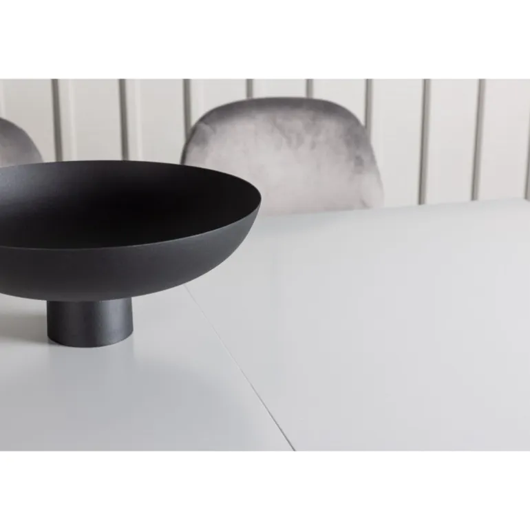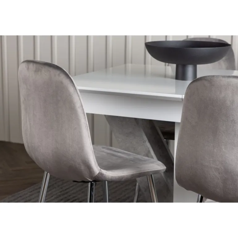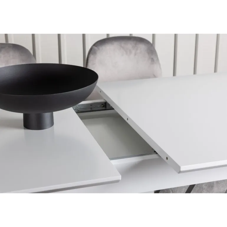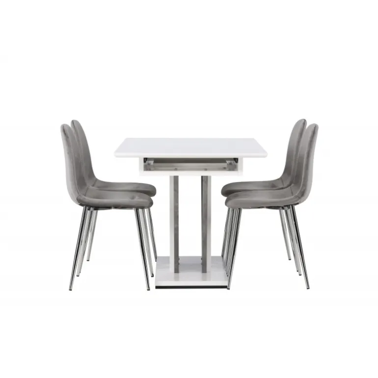 Dekorer dit hjem med behagelige farver, bløde materialer og tidløst design. Med dette udtrækkelige Spisebordssæt kan du nemt justere dine middagsinvitationer efter dine præferencer! Vores hvide spisebord Disa har en rektangulær bordplade i hvid MDF, en centerplaceret base i samme materiale og to grå MDF-rammer. En af de fantastiske fordele ved dette spisebord er dets udtrækkelige funktion, som gør det muligt at rumme både små og store forsamlinger. Bordets dimensioner: 120/160x80cm. Sammen med det udtrækkelige spisebord tilbyder vi vores lysegrå spisebordsstole fra Eva-serien. Disse stole har et fuldt polstret design med en let afrundet ryg og et sæde i luksuriøst velourstof. De smukke lysegrå metalben tilføjer et moderne touch til Spisebordssættet, hvilket gør det til et charmerende midtpunkt i dit hjem. Giv din stue den stil, den fortjener med dette Spisebordssæt!