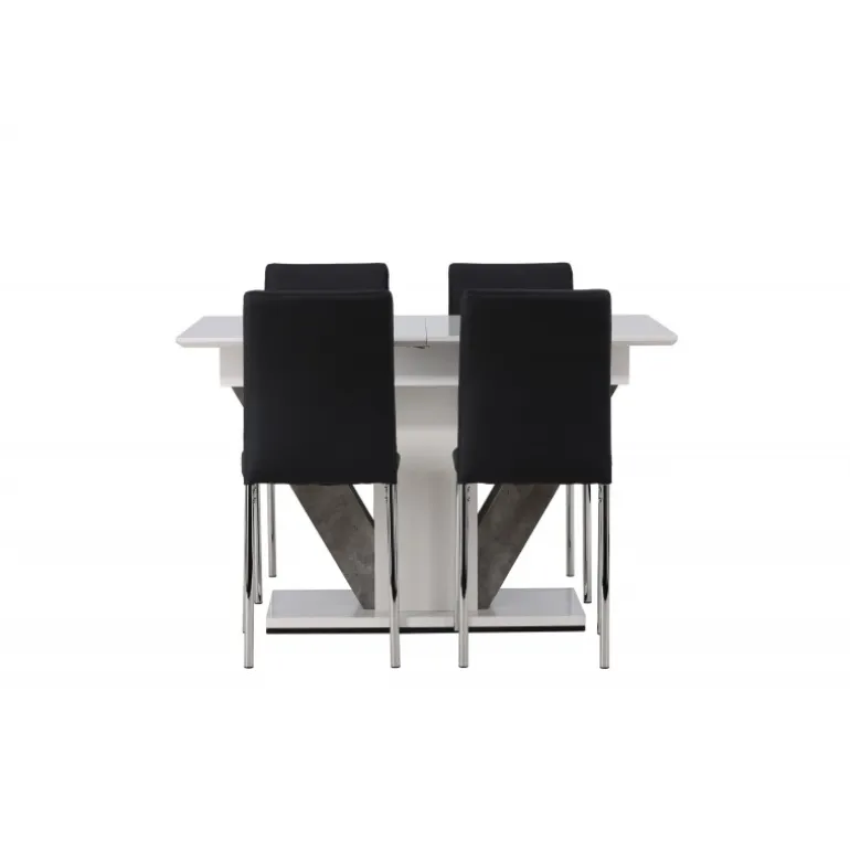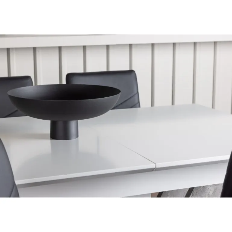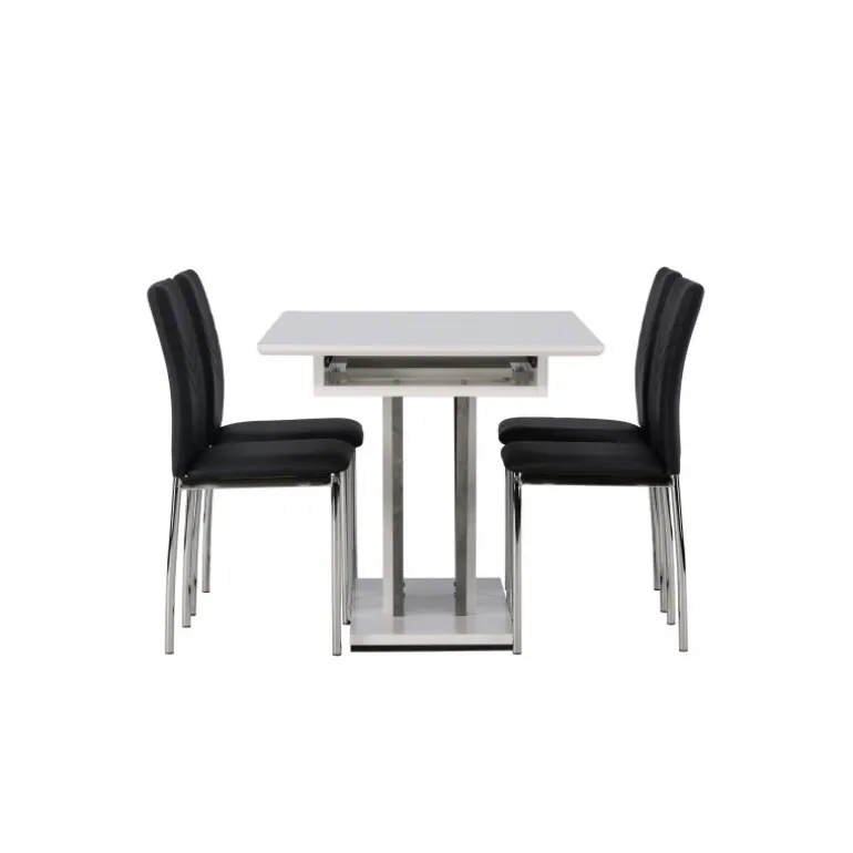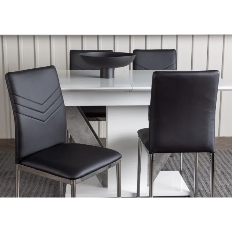 En vidunderlig farvekombination – dette udtrækkelige Spisebordssæt kommer i en elegant nuance, enkelt design og tidløst layout, der tilpasser sig dine præferencer! Vores hvide spisebord Disa har en rektangulær bordplade i hvid MDF, med en centralt placeret base i samme materiale og to ben i grå MDF. En af de fantastiske fordele ved dette spisebord er dens udtrækkelige funktion, der gør det muligt at rumme både små og store sammenkomster. Målene på bordet er 120/160x80cm. Sammen med det hvide spisebord Disa tilbyder vi vores sorte spisebordsstole fra Lily-serien, med deres skandinaviske design og tidløse nordiske former. Disse stole er enkle, men utroligt smukke. Den sorte kunstlæderpolstring giver en dristig følelse, mens de krom stolben tilføjer et industrielt touch. De dekorative sømme langs ryglænet tilføjer en stilfuld detalje – her får du både et imponerende Spisebordssæt og en behagelig siddeplads til fremtidige måltider!