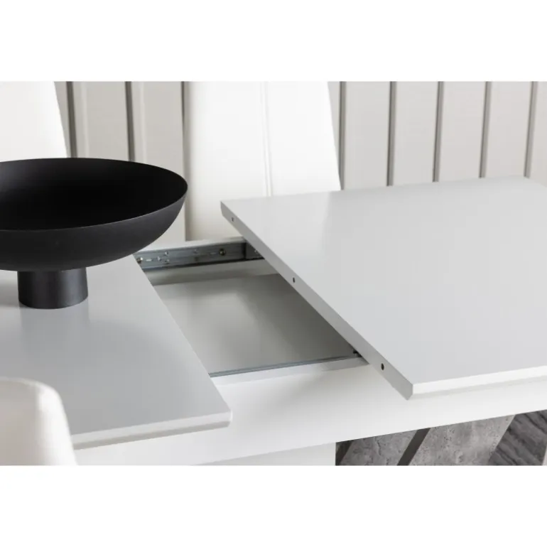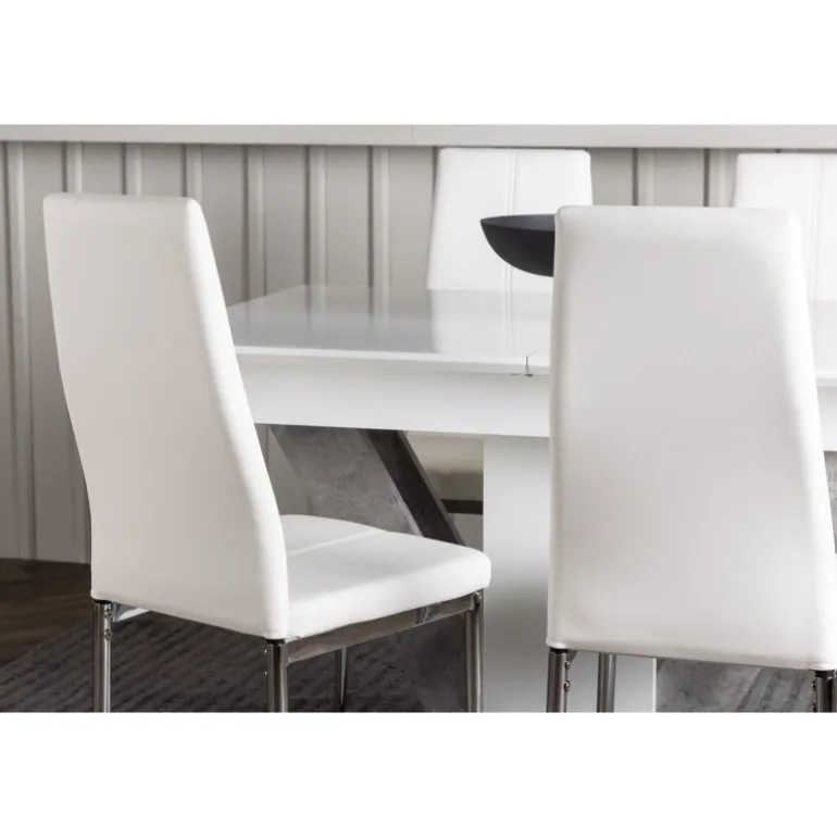 Dette rektangulære Spisebordssæt kombinerer stil og funktionalitet på en fantastisk måde! Vores hvide spisebord, Disa, har en rektangulær bordplade lavet af hvid MDF og en centralt placeret base i samme materiale, sammen med to baser i grå MDF. En af de fantastiske fordele ved dette spisebord er dets udtræksfunktion, som gør det nemt at rumme både små og store sammenkomster. Bordets dimensioner: 120/160x80cm. For at fuldende Spisebordssættet er det hvide bord parret med vores magnifikke Pastill-spisestole. Disse stole har en høj ryg og en fuldt polstret sæde i hvidt kunstlæder for ekstra komfort. De lige ben i nordisk design er lavet af sølvfarvet metal og tilføjer en stilfuld detalje til det samlede billede. Uanset om det er en hyggelig middag for to eller en festlig sammenkomst for familie og venner, vil dette Spisebordssæt være et pålideligt og imponerende midtpunkt i dit hjem!