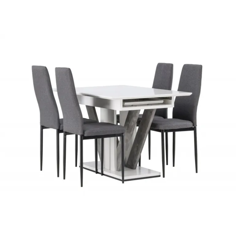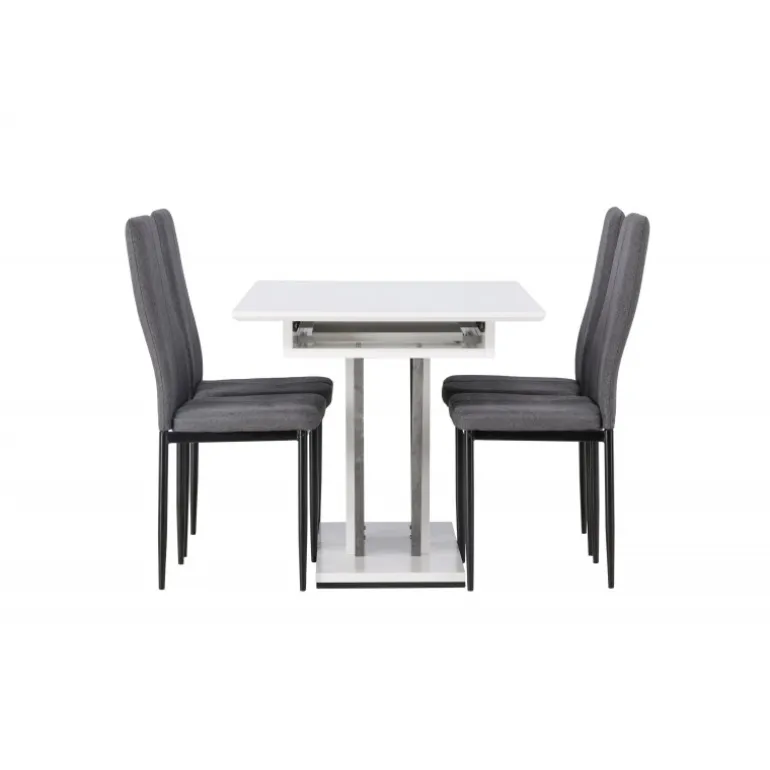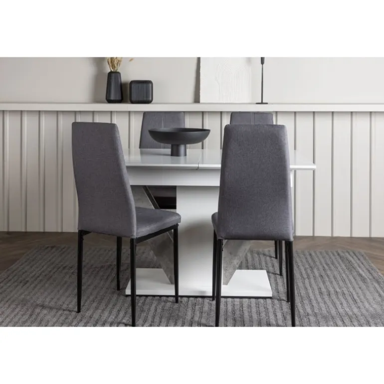 Velkommen hjem til et trend-sikret Spisebordssæt, der fokuserer på høj komfort, bæredygtige materialer og elegant design! Vores udtrækkelige spisebord Disa har en rektangulær bordplade i hvid MDF. Rammen er robust og lavet af samme materiale, med to grå MDF-rammer, der tilføjer en stilfuld detalje. Bordets dimensioner er 120/160×80 cm. For at ledsage dette fantastiske hvide spisebord har vi parret det med vores grå spisebordsstole Petra, som er det ultimative udtryk for komfort og stil. Med en høj ryg og et fuldt polstret sæde i gråt polyesterstof tilbyder disse stole det perfekte sted at slappe af og nyde dine måltider. Stolenes sorte metalben tilføjer et moderne touch til det tidløse design og komplementerer spisebordets udseende perfekt. Sammen skaber de en harmonisk kombination af form og funktion, der vil pryde hjertet af dit hjem!