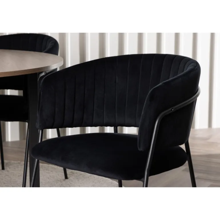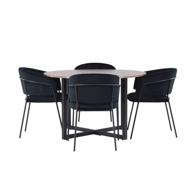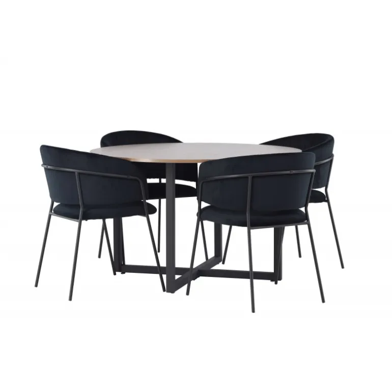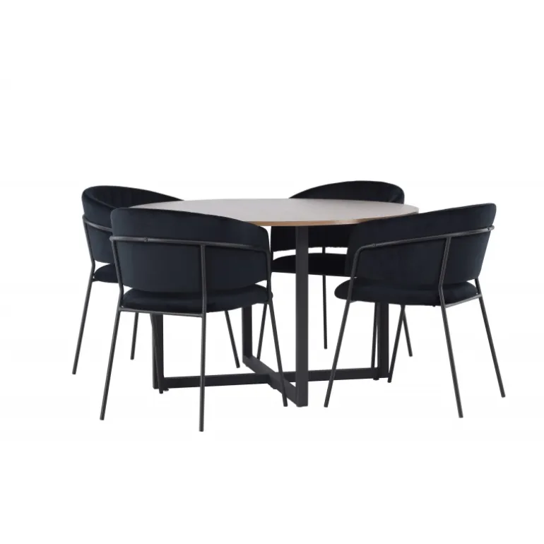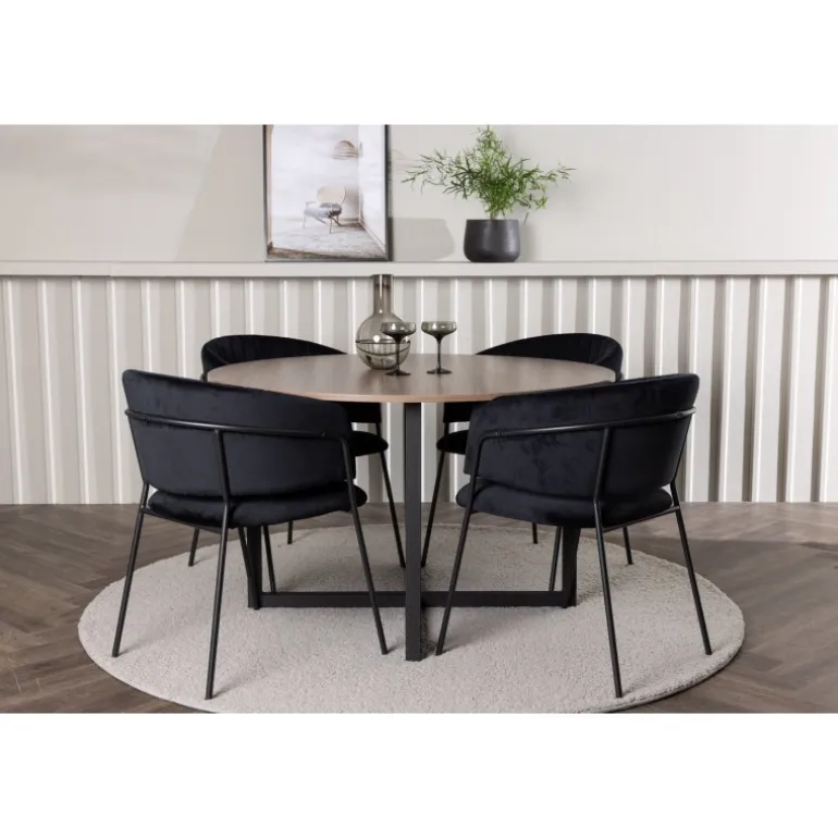 Dette er ikke bare en almindelig Spisebordssæt – det er en oplevelse, der vil lyse dine middage op med høj komfort og tidløst design! Vores runde spisebord Durango kombinerer afrundede former med et moderne design, der virkelig står tidens test. Med sin træfarvede MDF bordplade skaber det en varm og indbydende atmosfære i dit hjem. Bordet har ben i sort metal, der er samlet i en gulvnær kryds, hvilket bliver en stilfuld detalje til helheden. Borddimensioner: 120 cm. Her matches bordet med sorte spisestole fra Selma-serien. Stolen har et fuldt polstret design med en let afrundet ryg og et luksuriøst sæde i velourstof. De stilfulde dekorative syninger tilføjer et strejf af elegance, mens de smalle stoleben i sort stål giver en moderne følelse. Stolens ergonomiske design giver perfekt støtte til ryggen og lader dig sidde komfortabelt under lange middage eller hyggelige sammenkomster. Her får du virkelig en elegant Spisebordssæt, der vil hæve stilniveauet i dit hjem!