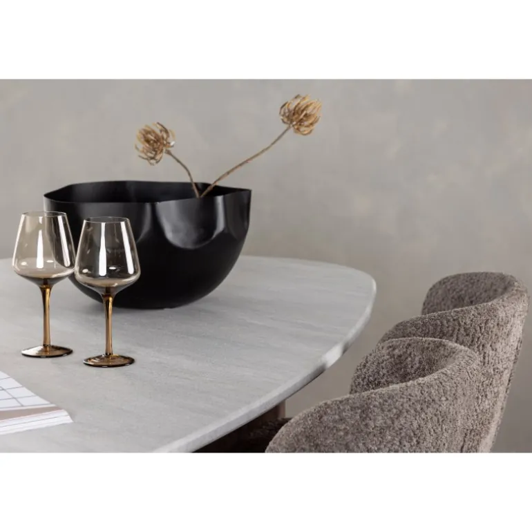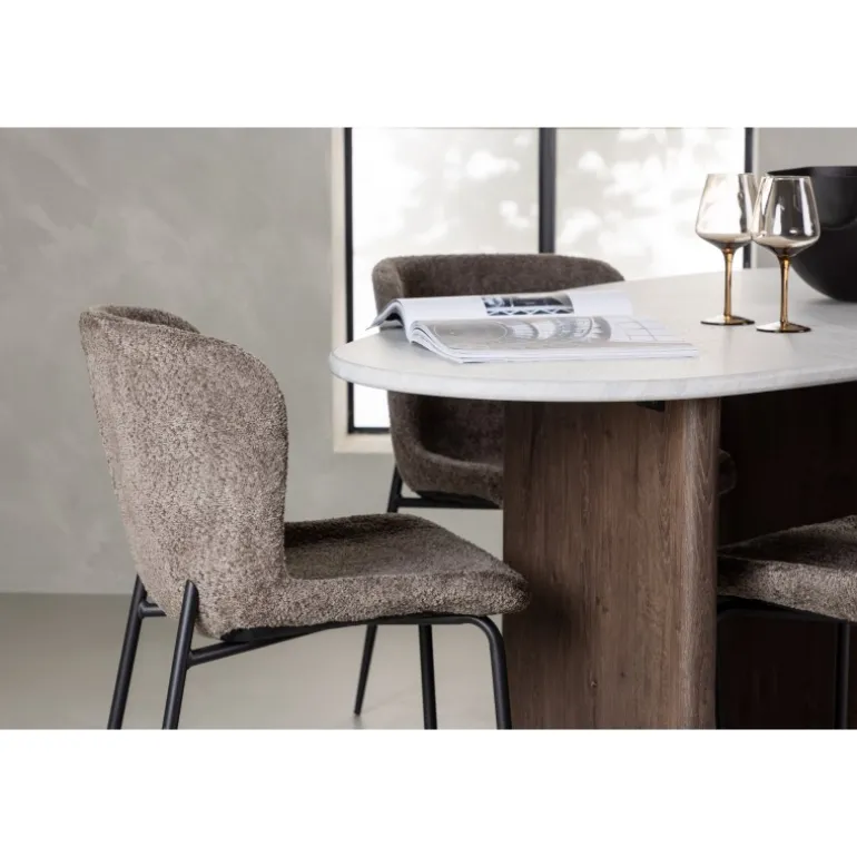 Et stilfuldt, rent og smart Spisebordssæt, der hurtigt løfter dit interiør til nye højder! Vores vidunderlige ovale spisebord Gronvik har en uregelmæssig bordplade i lys grå MDF med betoneffekt, hvilket tilføjer et moderne touch til hjertet af dit hjem. Bordpladen understøttes af to tynde træpaneler i en moderne mørkebrun farve, der udstråler charme og ro for øjet. Bordets dimensioner: 180×75 cm. Her kombineret med stole fra Modesto-serien, som opnår den perfekte balance mellem komfort og stil. Stolen, klædt i røggrå plys stof, har en slank følelse og trendy design, der passer perfekt til nordiske former. De rene, slanke stoleben i sort metal giver et moderne udtryk, der komplementerer designet af Gronvik-bordet bemærkelsesværdigt. Med dette Spisebordssæt i dit hjem vil du ikke kun skabe en harmonisk og elegant atmosfære, men også et sted, hvor du og dine kære kan nyde tid sammen og dejlige måltider. Giv dit hjem den kærlighed, det fortjener!