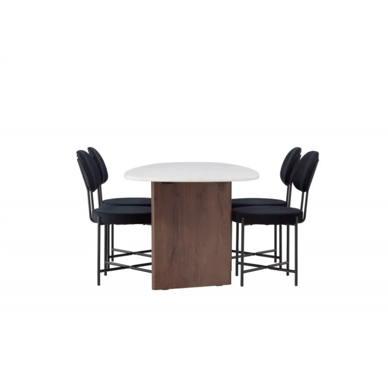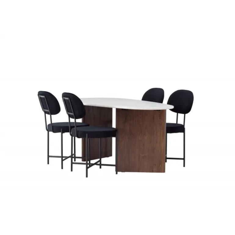 Skab dit drømmehjem med dette moderne Spisebordssæt i skandinavisk stil og personlig design! Her får du et stilfuldt og komfortabelt Spisebordssæt til alle festlige lejligheder. Gronvik spisebordet har en uregelmæssig bordplade i smukt lys grå MDF med betonlook, hvilket bidrager til et unikt fokuspunkt. Rammen består af to tynde træpaneler i en mørkebrun nuance, der giver solid støtte til bordet og sikrer langvarig holdbarhed og stabilitet. Bordets dimensioner: 180×75 cm. Her parret med spisebordsstole fra Stella-serien. Denne fløjlsbetrukne spisebordsstol tilbyder et trendy, skandinavisk design med et rundt sæde og ryglæn i luksuriøs sort fløjl. De sorte stålbensstole giver et moderne og stilfuldt udtryk. Nyd måltider med familie og venner ved dette fantastiske bord og mærk den skandinaviske touch omslutte dig. Et personligt Spisebordssæt, der vil blive dit yndlingssted i hjemmet i fremtiden!