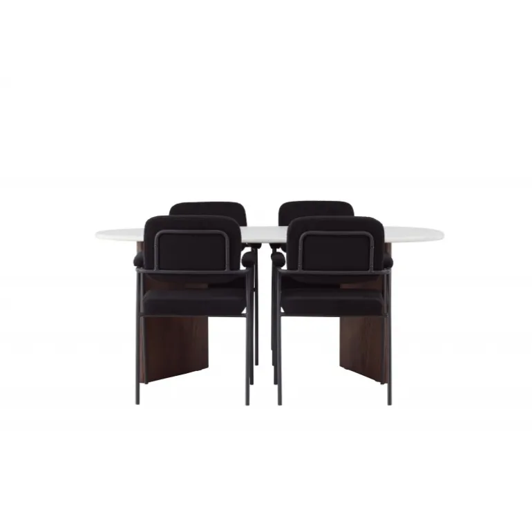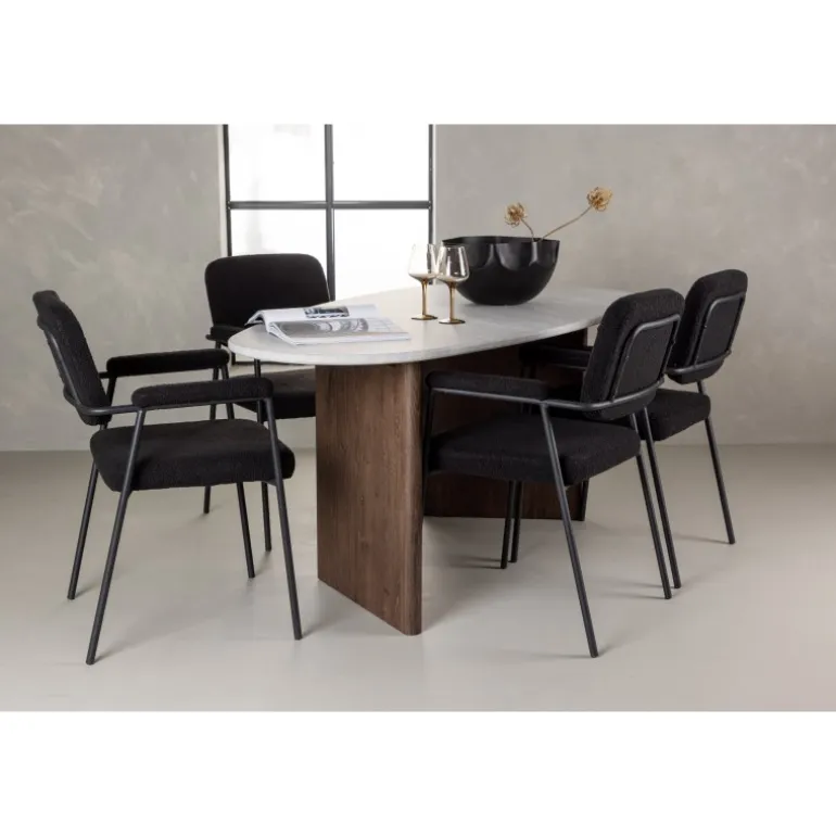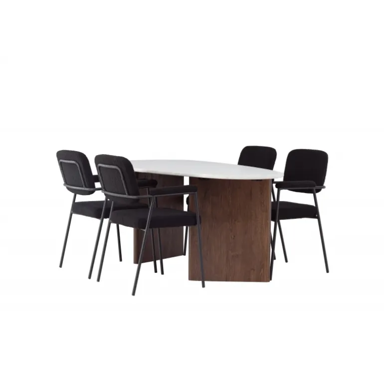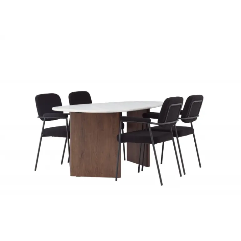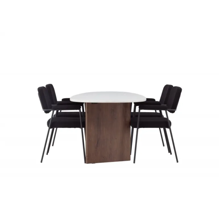 Velkommen hjem til et charmerende midtpunkt, der pryder din stue – dette Spisebordssæt løfter din indretning til nye højder! Med sin skandinaviske oprindelse og sofistikerede design er dette spisebord og de matchende spisebordsstole en uovertruffen kombination til dit hjem. Vores ovale spisebord Gronvik udstråler minimalistisk charme og personlig stil. Den uregelmæssige bordplade i lys grå MDF med betonlook giver et unikt og trendy udseende, og de to tynde træpaneler i en smagfuld mørkebrun farve, der understøtter bordet, sikrer god stabilitet. Bordets dimensioner: 180×75 cm. Her i en stilfuld kombination med vores komfortable spisebordsstole fra Yesterday-serien. En stol designet til at give maksimal komfort. Det fuldt polstrede sæde i sort bouclé stof og de slanke stoleben med integrerede armlæn i sort metal tilbyder både støtte og luksuriøs komfort. Med de blødt polstrede sæder inviterer Spisebordssættet til lange, behagelige middagsstunder. Her samles familie og venner for at skabe minder og nyde samvær, og du vil føle dig stolt over at have et så indbydende miljø og Spisebordssæt i dit hjem!