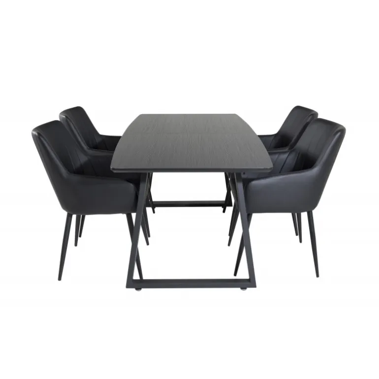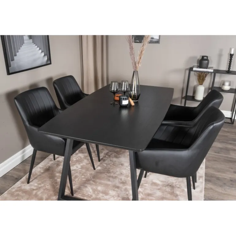 Spisebordssæt Inca med stole Comfort kombinerer slankt design med høj siddekomfort. Den sorte spisebordsoverflade i MDF og papirlaminat giver et moderne udtryk, mens de komfortable stole inviterer til lange og hyggelige sammenkomster. Dette trendy Spisebordssæt er ideelt til dem, der ønsker at skabe en stilfuld spiseoplevelse i hjemmet.