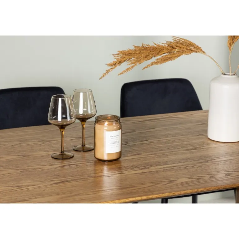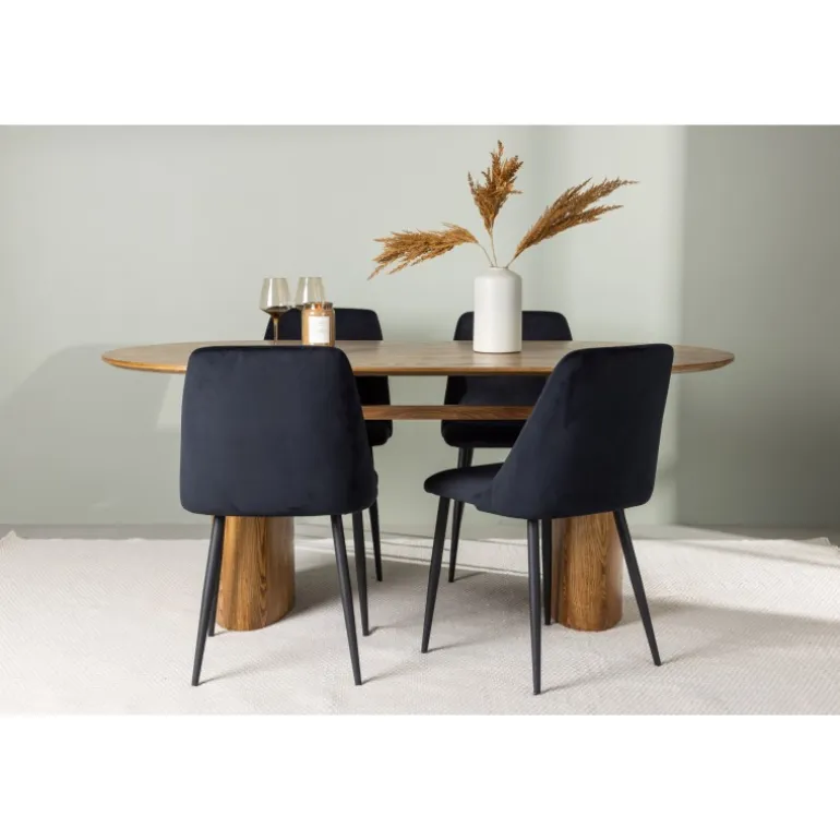 Skab et imponerende midtpunkt i din stue med dette ovale Spisebordssæt i robust stil! Vores ovale spisebord, Isolde, er den perfekte kombination af moderne design og holdbarhed. Den trendy naturlige træfarve giver en varm og indbydende følelse til dit hjem. Den ovale MDF-bordplade, sammen med den solide ramme, danner en smuk helhed, og det levende materiale tilføjer en dejlig bevægelse, der fremhæver bordets unikke karakter. Bordets dimensioner er 140x75cm. Vores sorte fløjlsstole fra Night-serien er den perfekte komplement til bordet. Med et fuldt polstret sæde i sort fløjlsstof omslutter stolen din krop i luksus og komfort. De matchende sorte stoleben er elegante og skaber en sammenhængende æstetik sammen med Isolde spisebordet. Nyd måltider med stil og komfort, når du vælger dette elegante Spisebordssæt. Skab minder ved dette storslåede spisebord og sid behageligt på de luksuriøse Night stole!