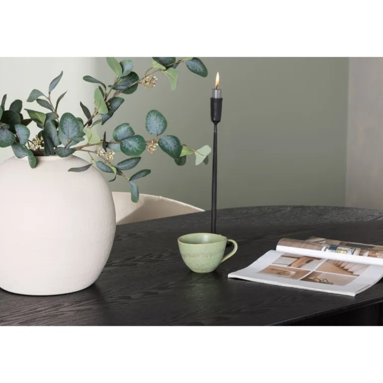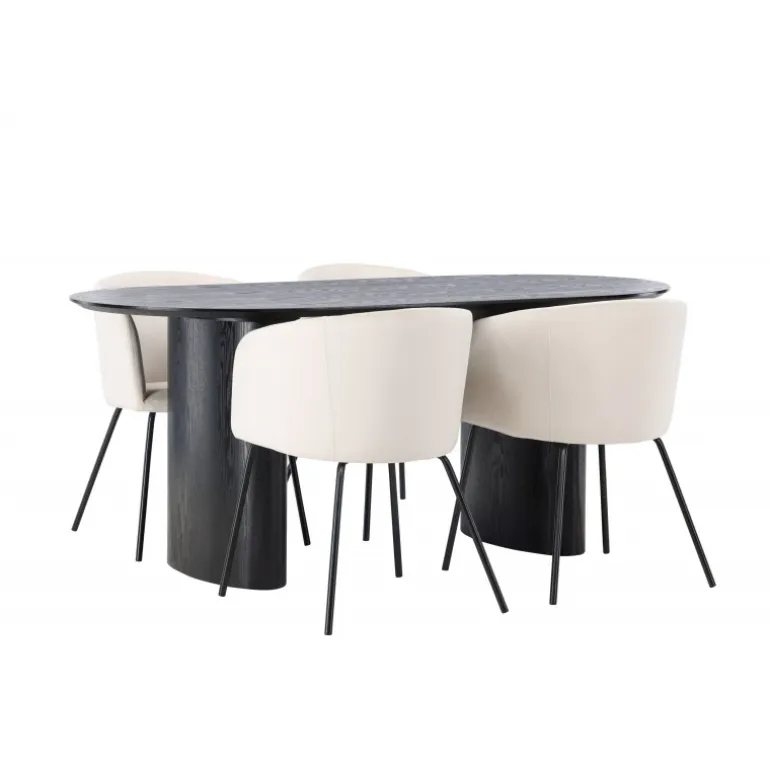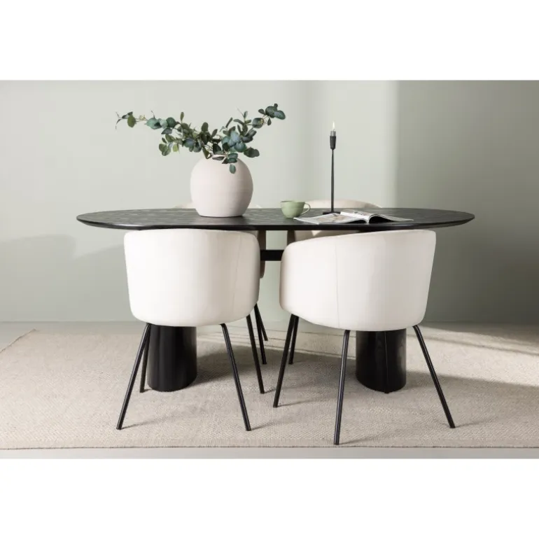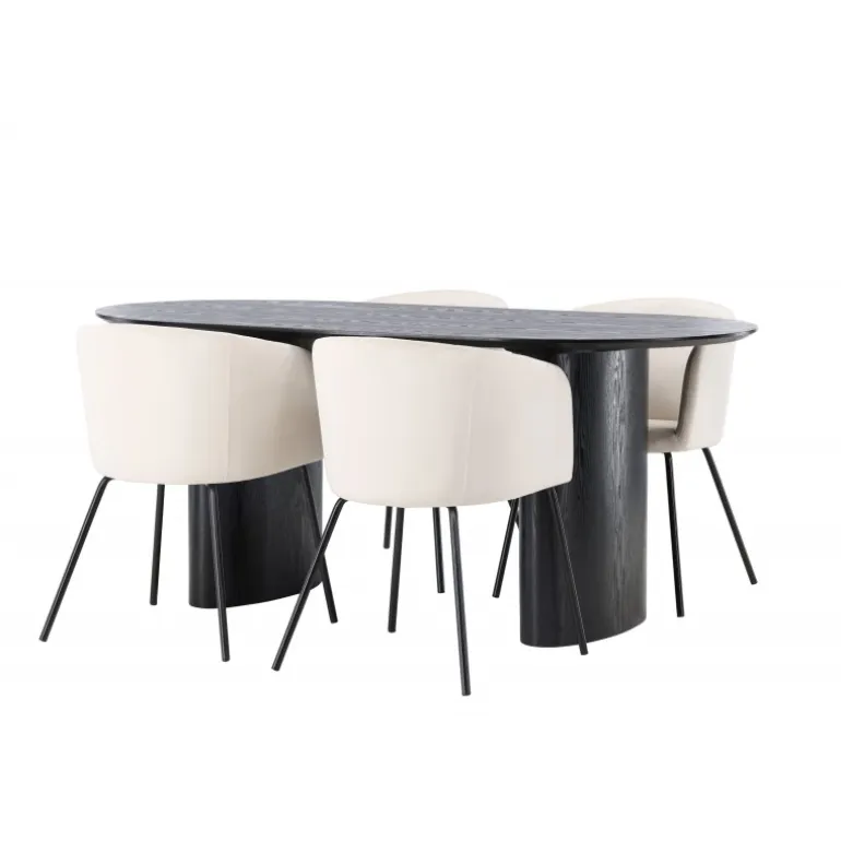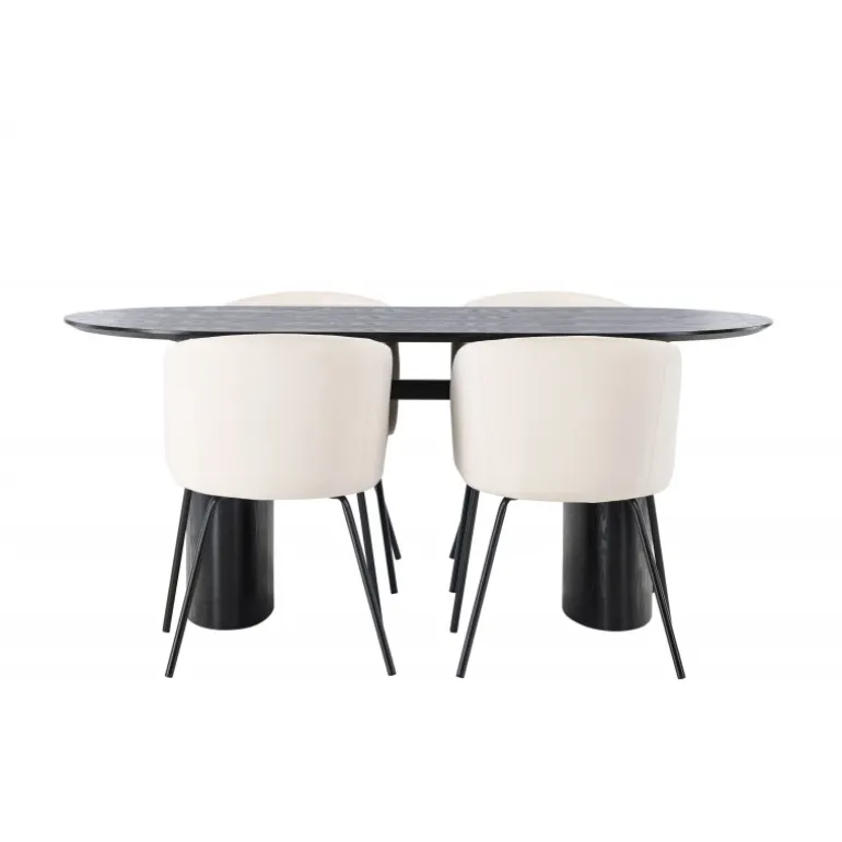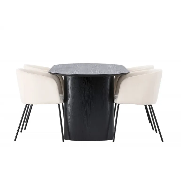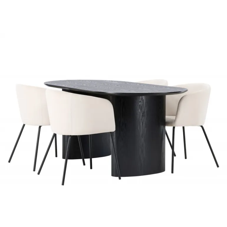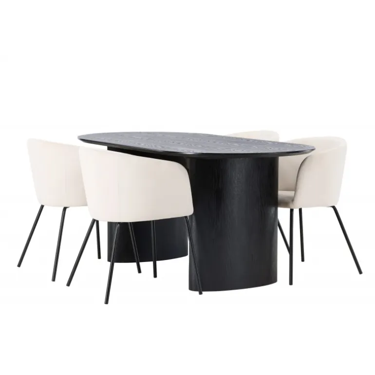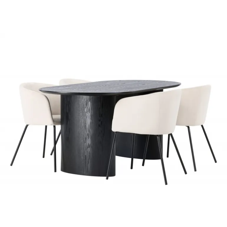 En fantastisk kombination i charmerende former! Det ovale spisebord Isolde i sort farve har et moderne design med en oval bordplade i MDF og en robust ramme, der giver et stabilt indtryk. Det levende materiale giver en smagfuld bevægelse til blikfanget. Her i elegant kombination med vores komfortable spisestole Berit. Stolen har et fuldt polstret design med en let rundet ryg og sæde i beige velourstof og smalle ben i sort jern. Det skal føles luksuriøst at sætte sig ned til gode måltider! Bordmål: 180×75 cm.
