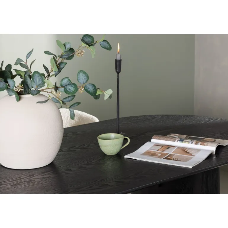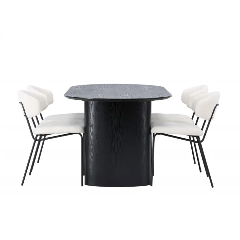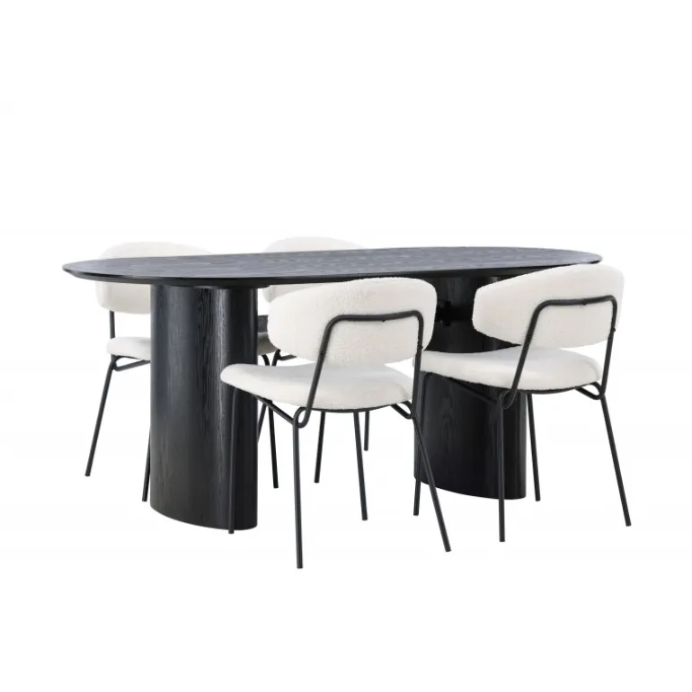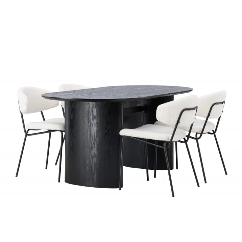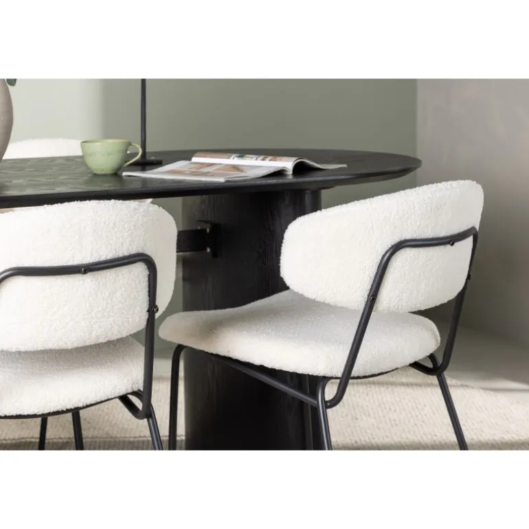 Pynt stuen med moderne former! Det ovale spisebord Isolde i sort farve har et moderne design med en oval bordplade i MDF og en robust ramme, der giver et stabilt indtryk. Det levende materiale giver en smagfuld bevægelse til blikfanget. Her i stilfuld kombination med vores hvide spisestuestole fra Chico-serien. Stolen er i hvid boucle-stof med en polstret sæde og ryglæn for ekstra komfort. Benene er smalle i sort stål, hvilket giver stolen en luftig følelse. Skab en indbydende atmosfære! Bordmål: 180x75cm.