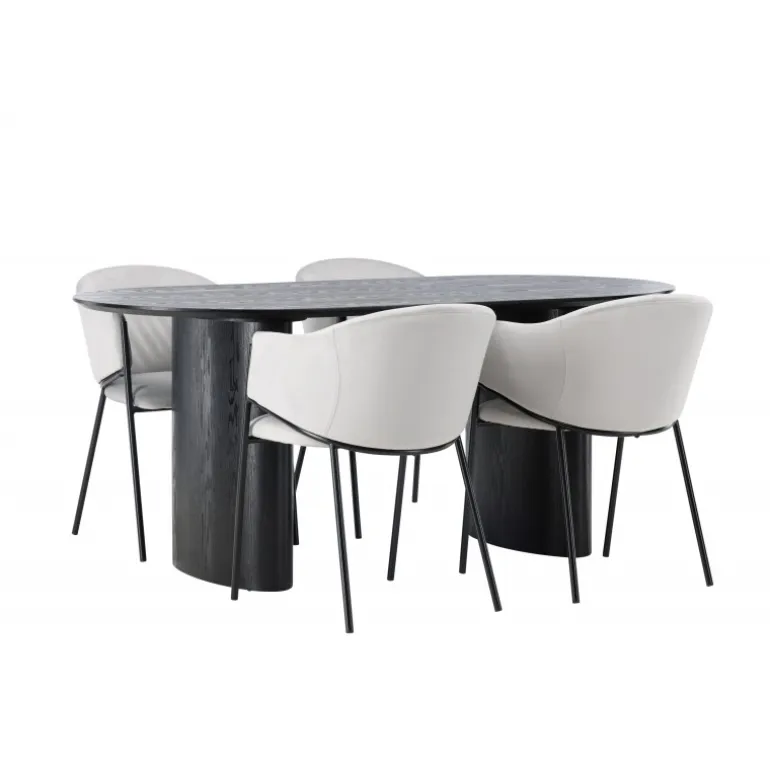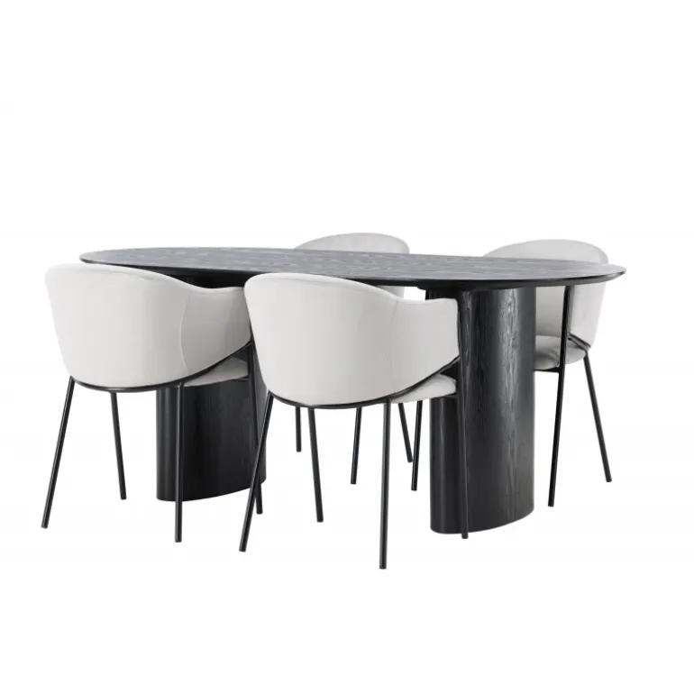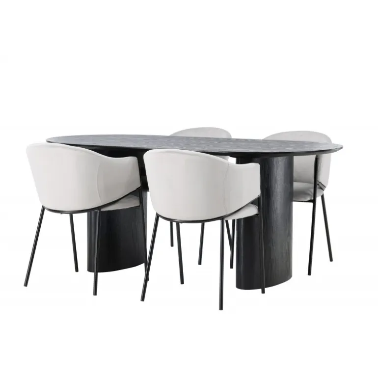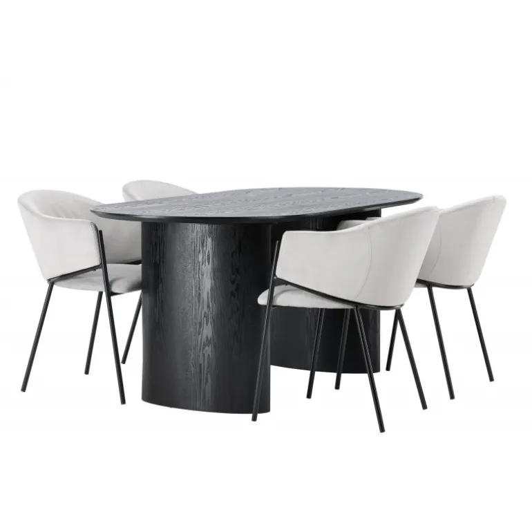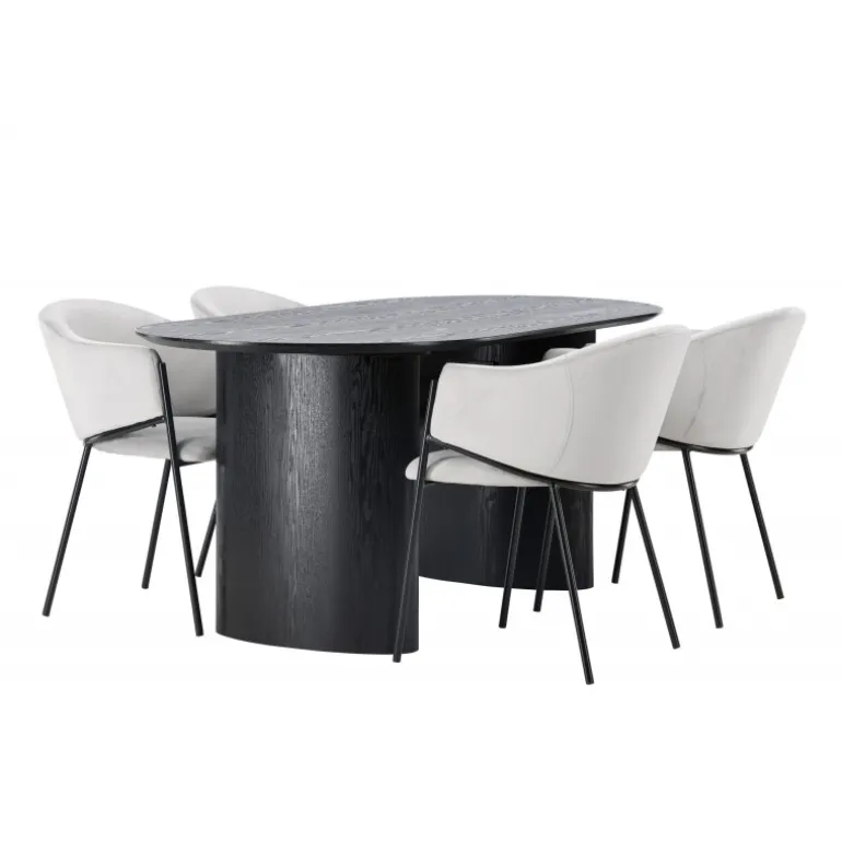 - Moderne design: Ovalt bord i sort MDF og grå stole i velour.