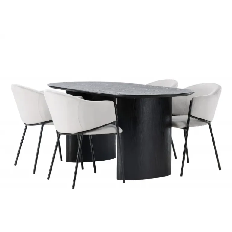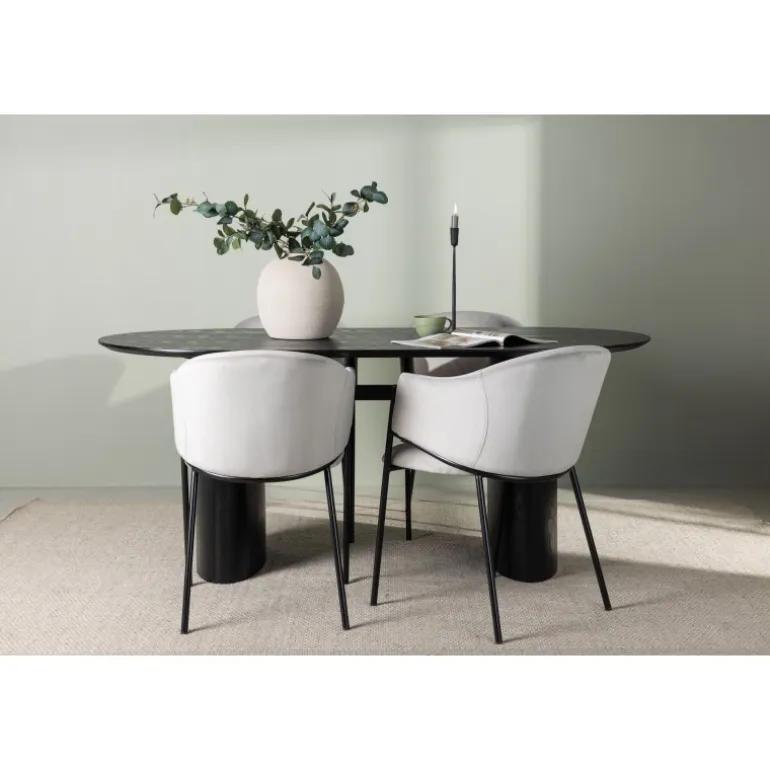 Moderne former og bløde materialer! Det ovale spisebord Isolde i sort farve har et moderne design med en oval bordplade i MDF og en robust ramme, der giver et stabilt indtryk. Det levende materiale giver en dejlig bevægelse til blikfanget. Her sammen med moderne, grå spisestole fra Evelina-serien. Stolen har et fuldt polstret sæde med en afrundet ryglæn i lysegrå velourstof og dekorativ, minimalistisk benstruktur i sort stål. En perfekt kombination til det moderne hjem! Bordmål: 180x75cm.