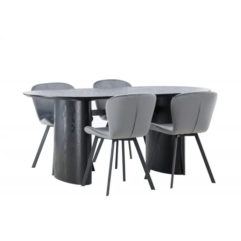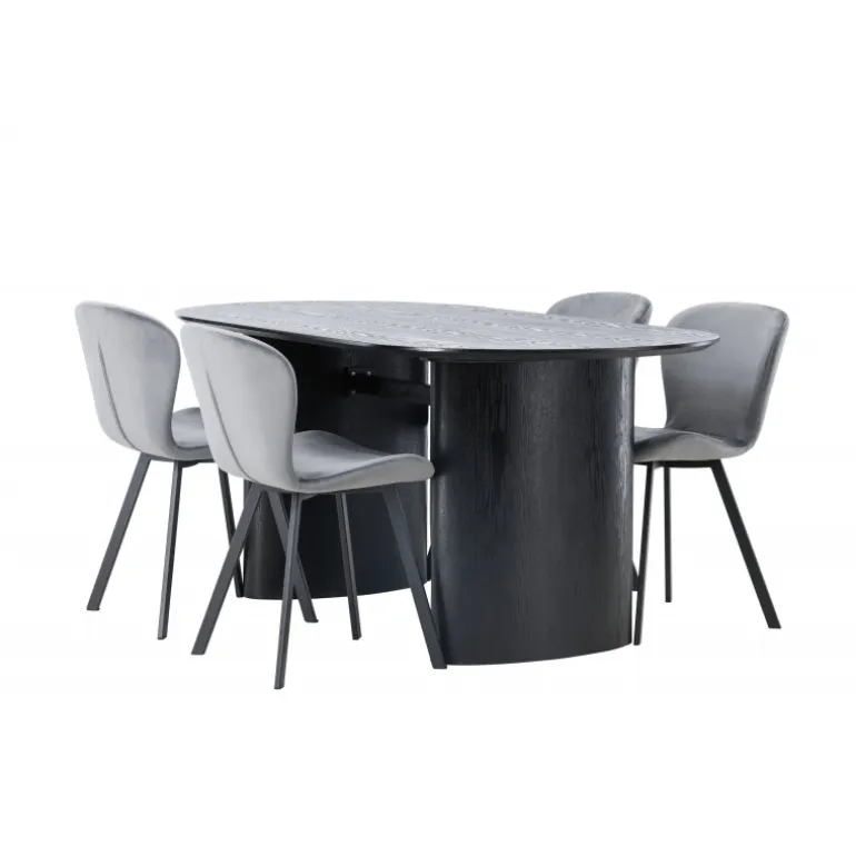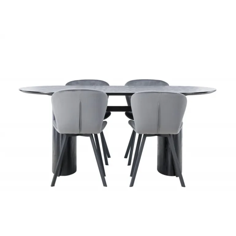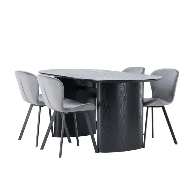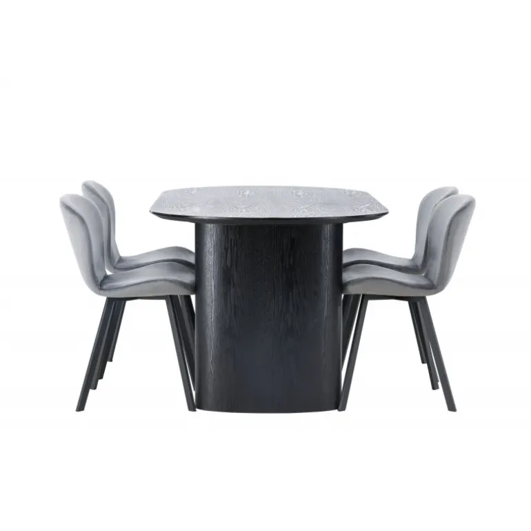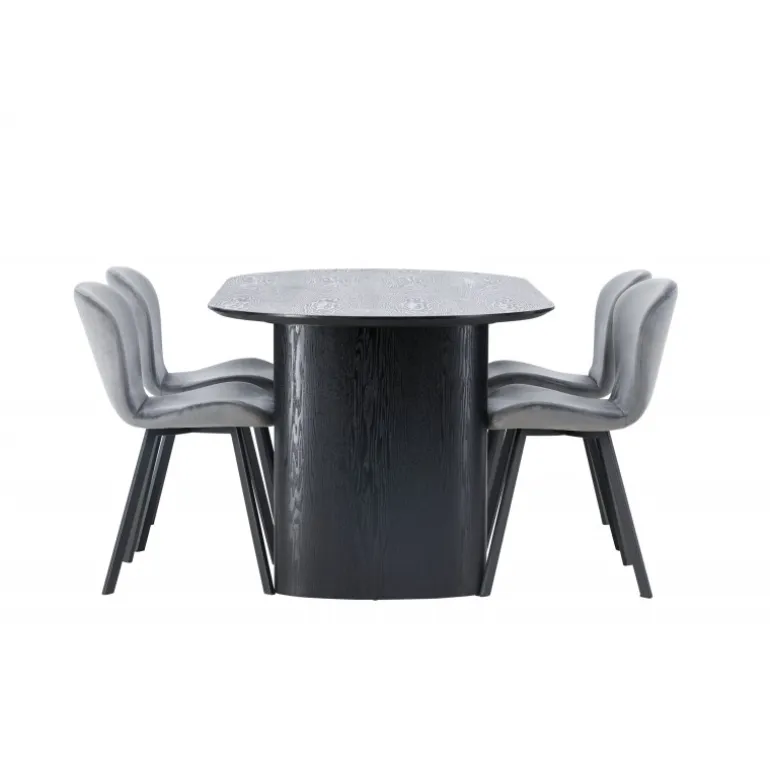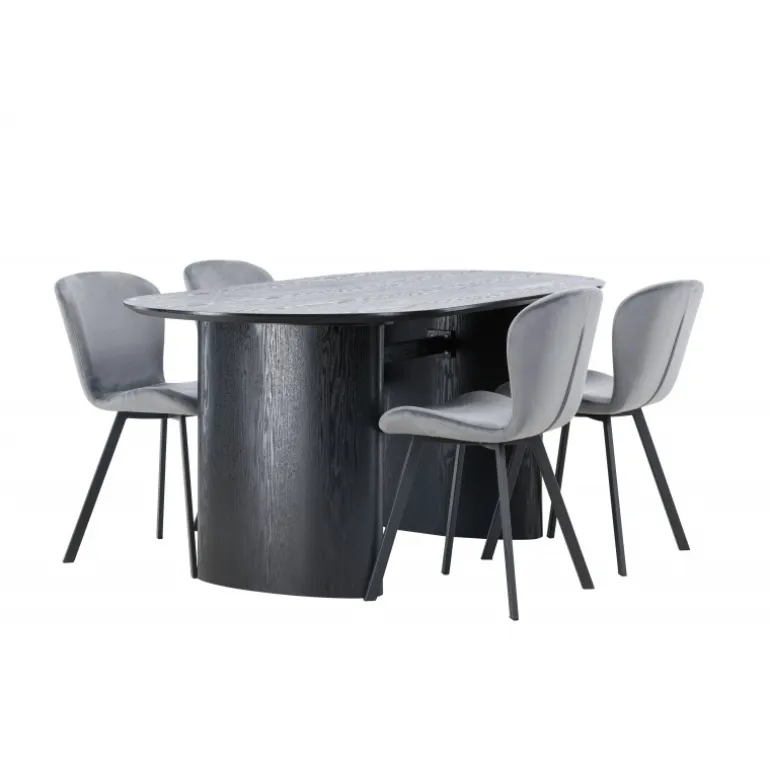 Nyd en behagelig farvekombination med Spisebordssættet Isolde og stole fra Lilja-serien. Det ovale spisebord Isolde i sort farve har et moderne design med en oval bordplade i MDF og en robust ramme, der giver et solidt indtryk. Den levende overflade giver et smukt visuelt spil. Her kombineret med beige spisebordsstole fra Lilja-serien, der har en fleksibel rund form, sæde i beige polyesterstof og let udstillede stoleben i sort metal. Skab en hjemlig atmosfære i stuen! Bordmål: 180×75 cm.