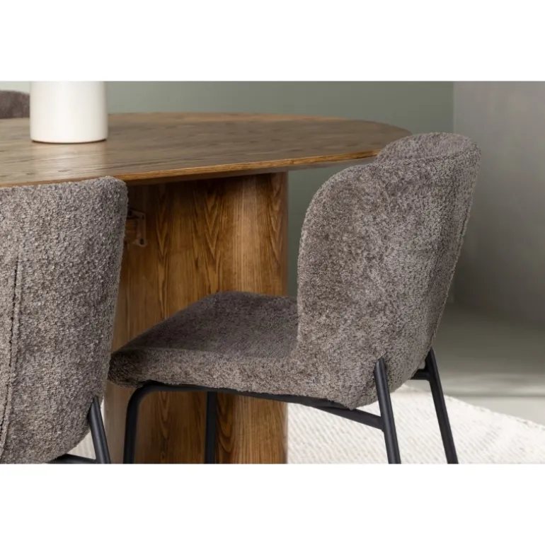 Med dette moderne Spisebordssæt kan du skabe en slank og indbydende atmosfære, der vil få dig til at glæde dig til at sætte dig ned og nyde god mad og behageligt selskab! Vores ovale spisebord i en robust stil fra Isolde-serien kommer i en trendy naturfarve. Bordet har en oval MDF-bordplade og en solid ramme, der giver et stabilt indtryk. Det livlige materiale tilføjer også en stilfuld detalje til bordets samlede udseende. Bordets dimensioner er 140×75 cm. Sættet fuldendes af vores luksuriøse spisestole fra Modesto-serien. Denne stol er polstret i et blødt, gråt plysstof, der giver en varm og indbydende følelse. De slanke, sorte metalben tilføjer et moderne touch til designet. Den let afrundede ryglæn og den polstrede sædepude giver ikke kun et elegant udseende, men også ekstra komfort, så du kan nyde lange middage. Skab dit drømmespiseområde med dette magnifikke Spisebordssæt. Oplev en kombination af skandinavisk design, moderne detaljer og høj komfort, der vil gøre din spisestue til et favoritsted i dit hjem!