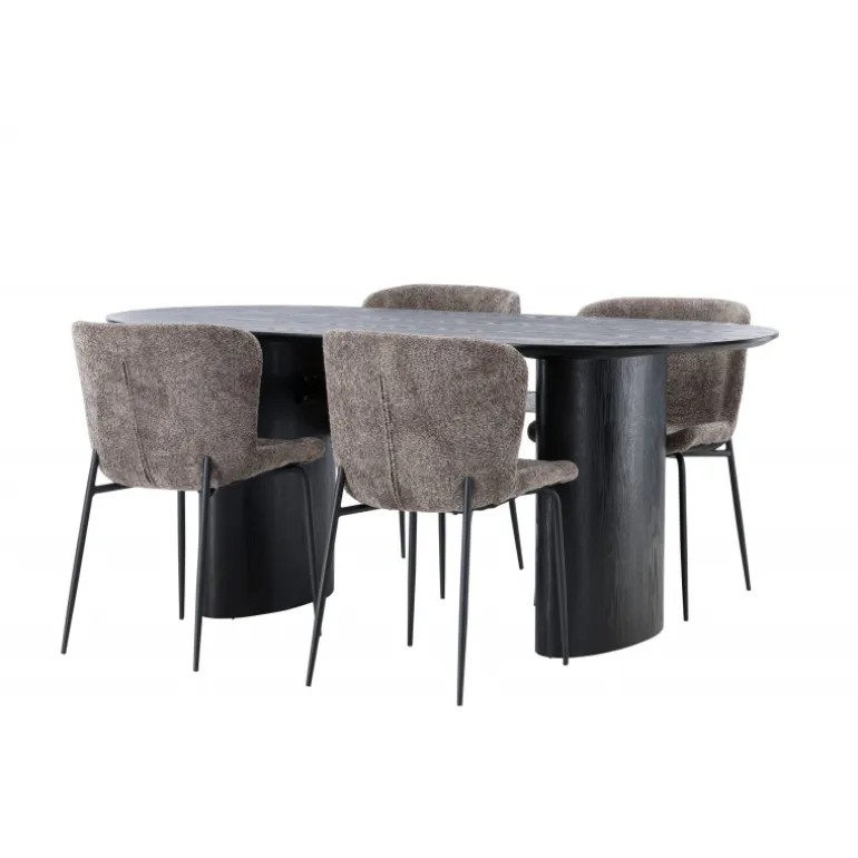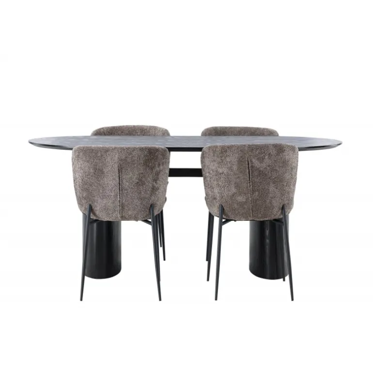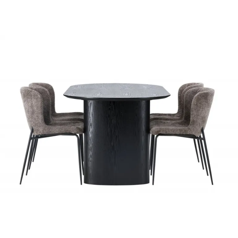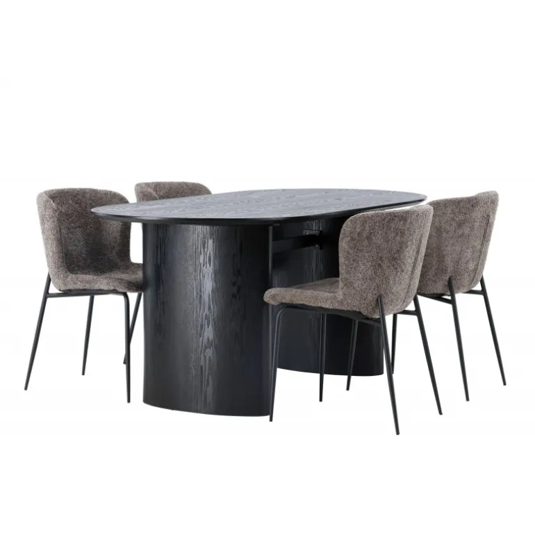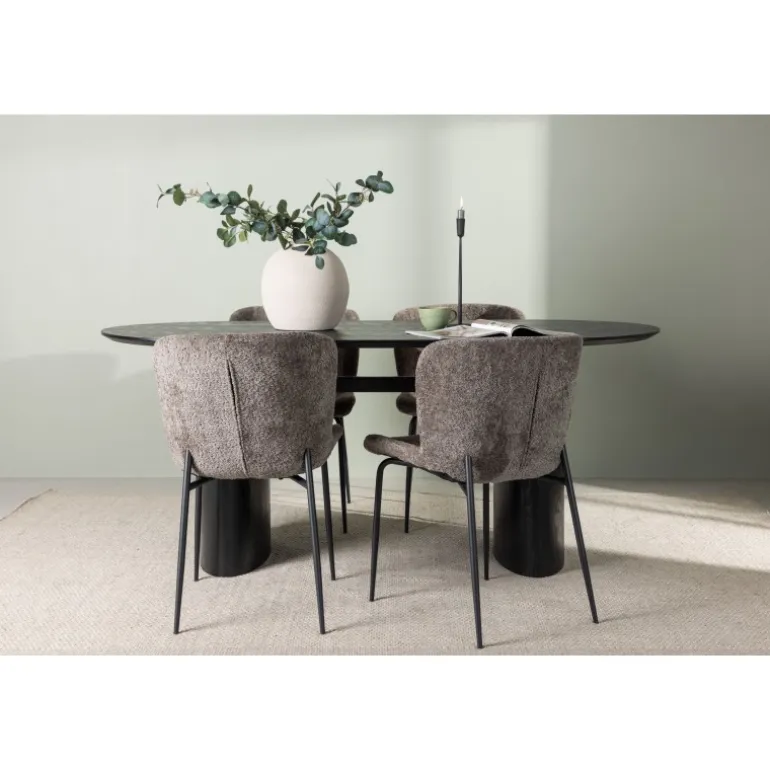 Skab et charmerende midtpunkt at samles omkring! Det ovale spisebord Isolde i sort farve har et moderne design med en oval bordplade i MDF og en robust ramme, der giver et stabilt indtryk. Dette levende materiale skaber en dejlig bevægelse som blikfang. Her sammen med modebevidste spisebordsstole fra Modesto-serien. Stolen er fuldt polstret i gråt shaggy stof med stilfulde smalle ben i sort metal. Den let afrundede ryg og polstrede sædepude giver ekstra komfort og forlænger hyggelige måltider omkring spisebordet. Borddimensioner: 180×75 cm.