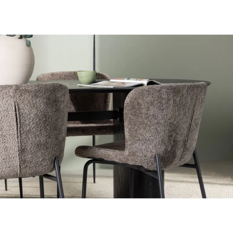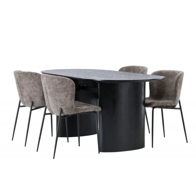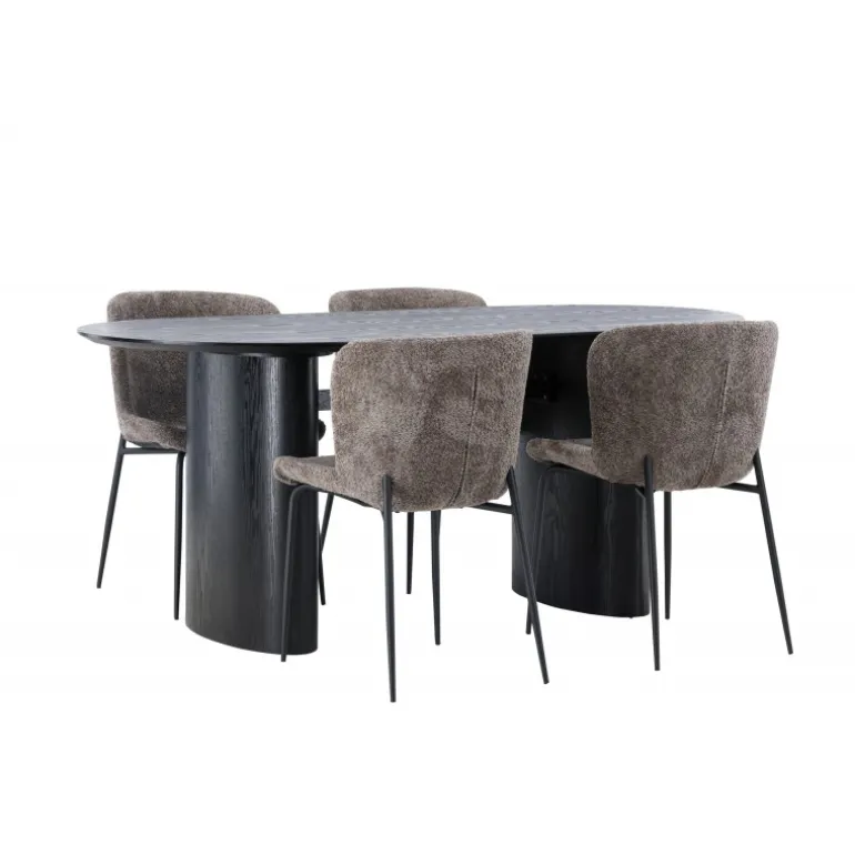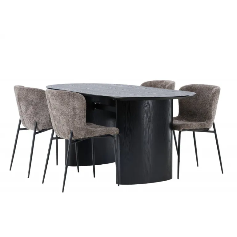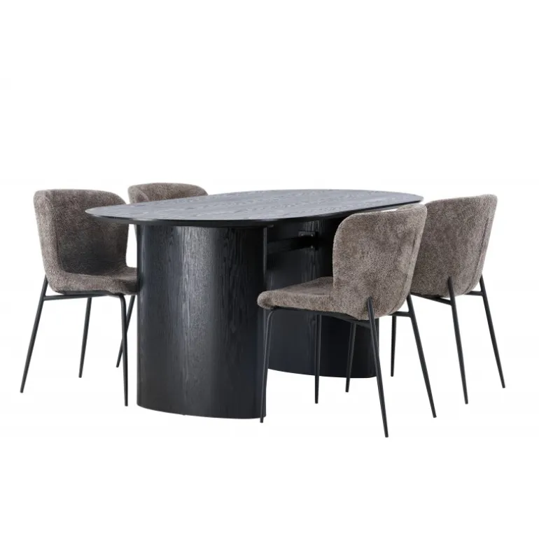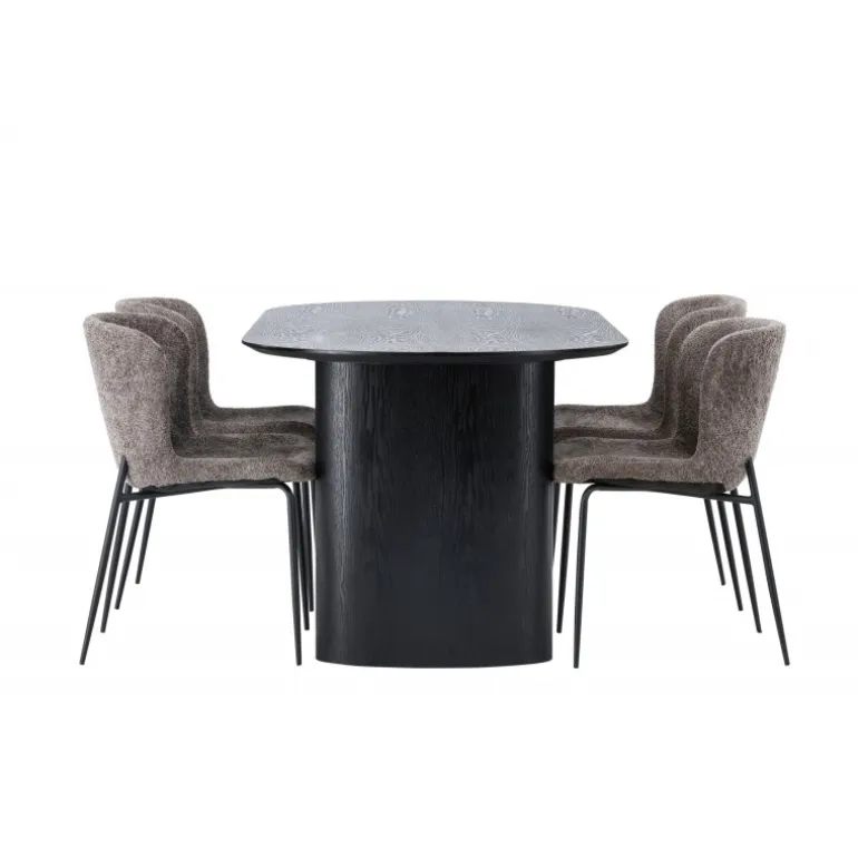 Skab et charmerende midtpunkt at samles omkring! Det ovale spisebord Isolde i sort farve har et moderne design med en oval bordplade i MDF og en robust ramme, der giver et stabilt indtryk. Dette levende materiale skaber en dejlig bevægelse som blikfang. Her sammen med modebevidste spisebordsstole fra Modesto-serien. Stolen er fuldt polstret i gråt shaggy stof med stilfulde smalle ben i sort metal. Den let afrundede ryg og polstrede sædepude giver ekstra komfort og forlænger hyggelige måltider omkring spisebordet. Borddimensioner: 180×75 cm.