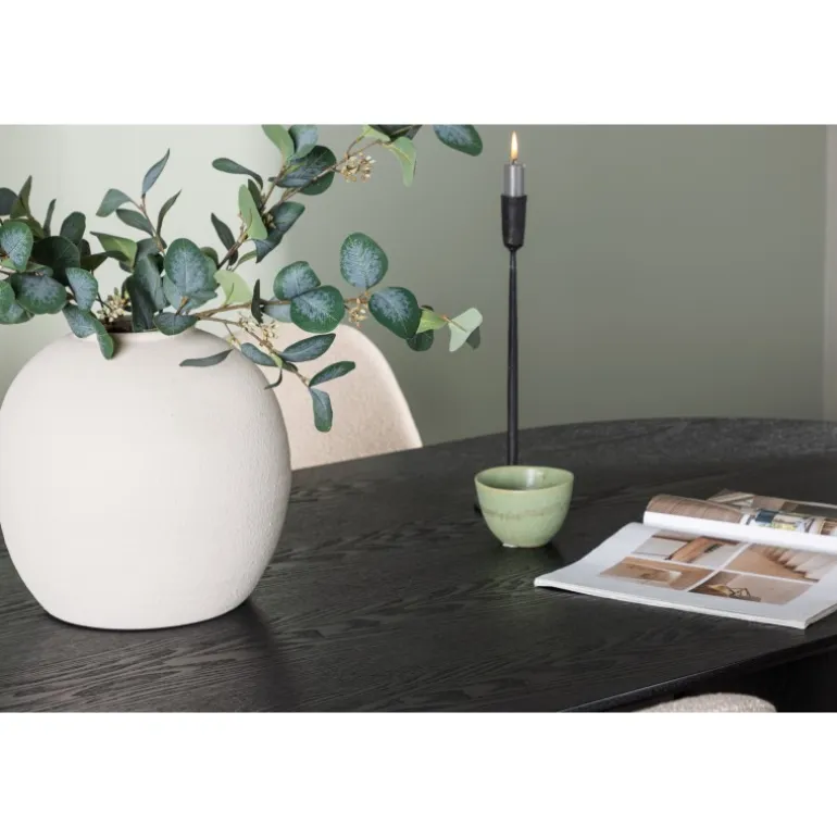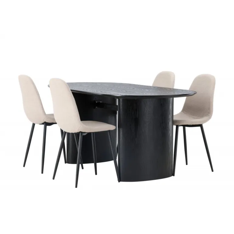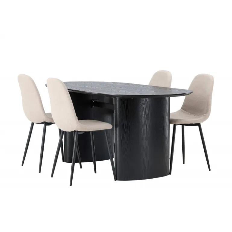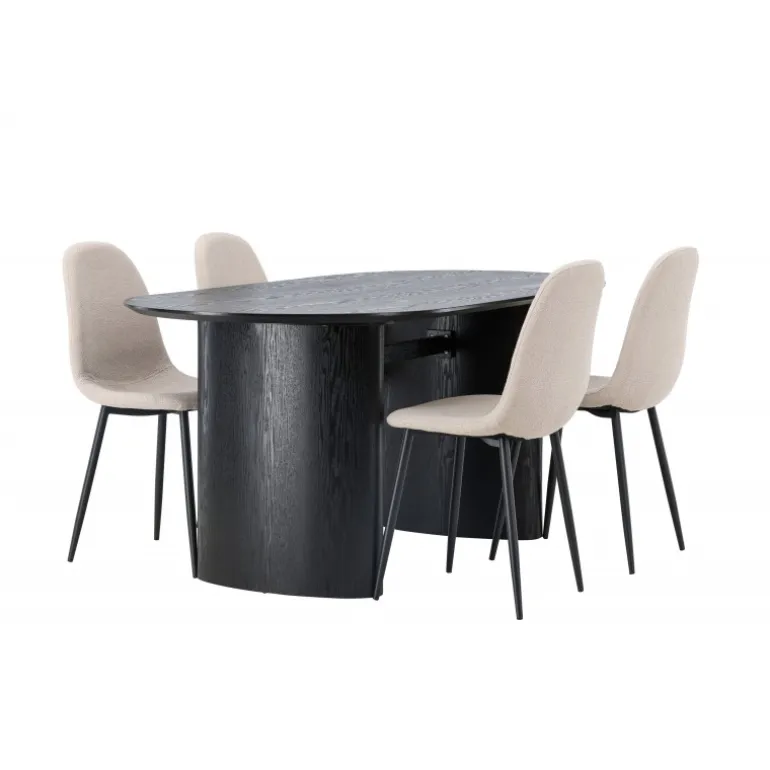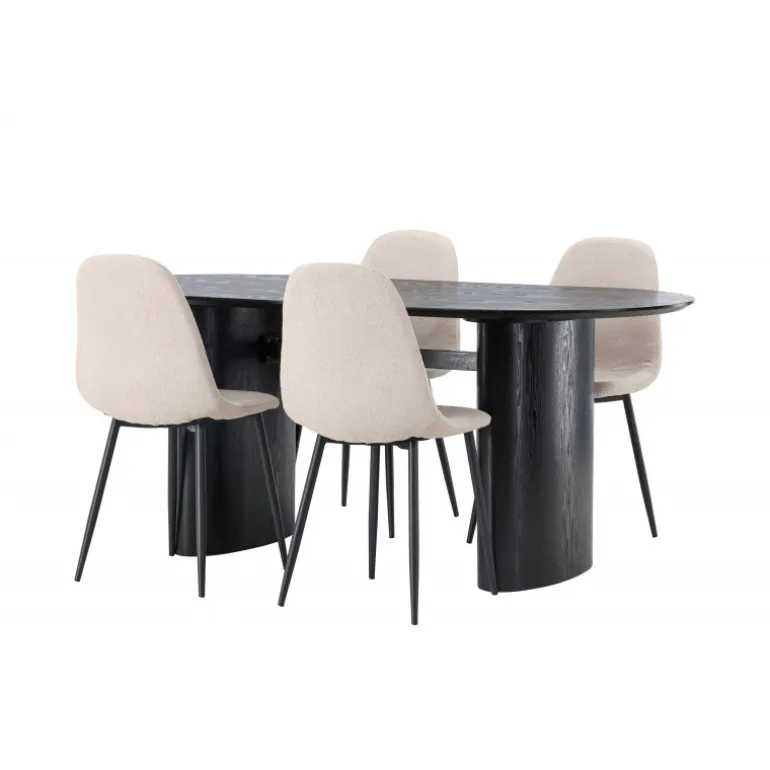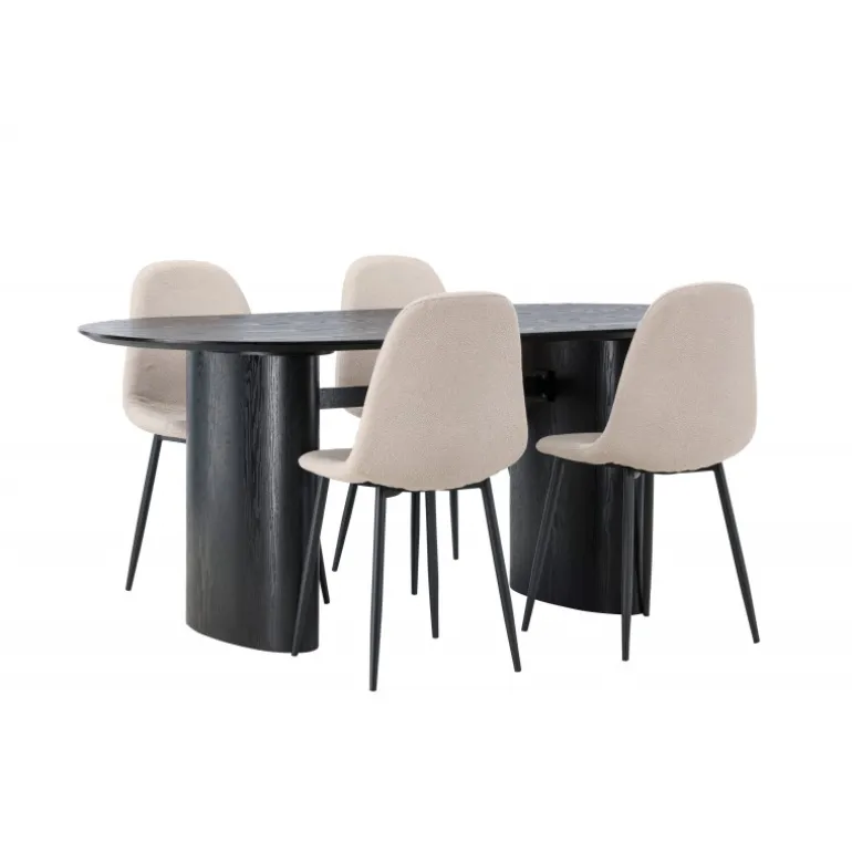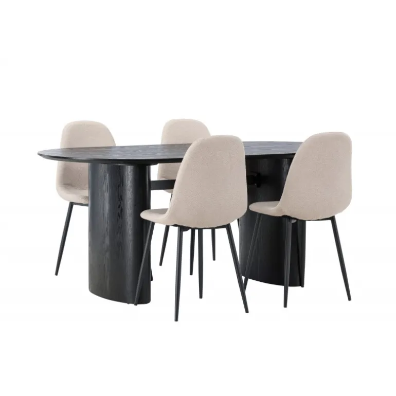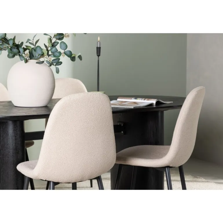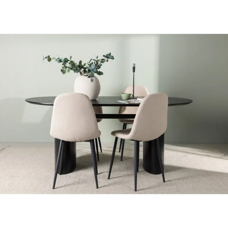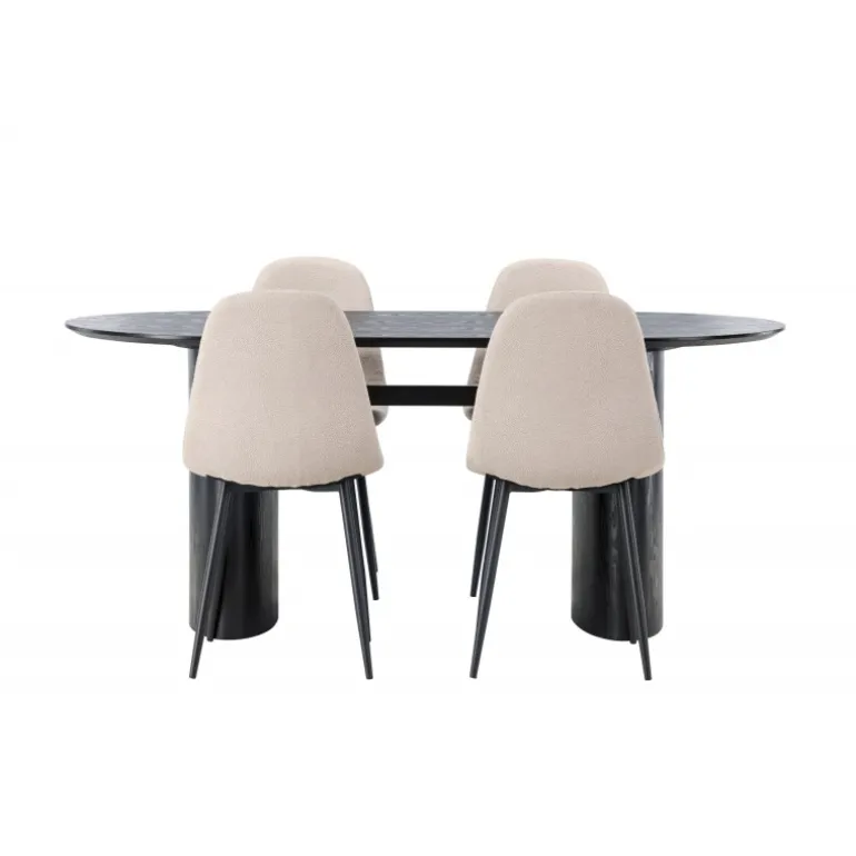 Trendsikkert spisebordssæt med holdbare materialer! Det ovale spisebord Isolde i sort farve har et moderne design med en oval bordplade i MDF og en robust ramme, der giver et solidt indtryk. Det levende materiale skaber en smuk bevægelse for øjet. Her præsenteret i en moderne kombination med beige spisestole fra Polar-serien. Stolen har et fuldt polstret design, ben i sort pulverlakeret metal og rundet ryg og sæde i beige bouclé-stof med blød polstring. Her kan du sidde komfortabelt i lang tid! Bordets dimensioner: 180×75 cm.