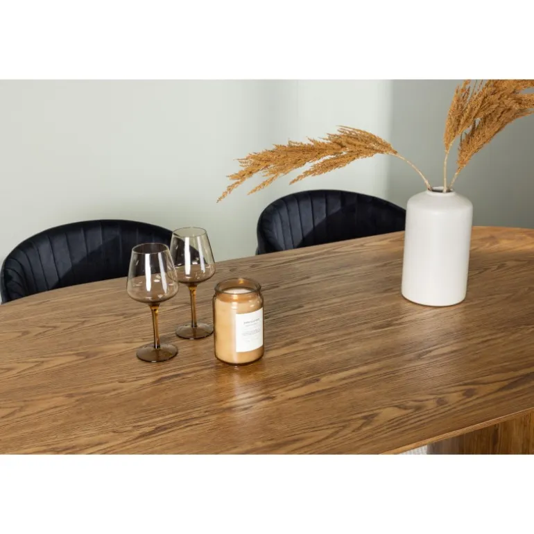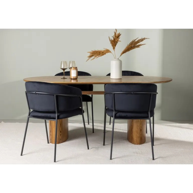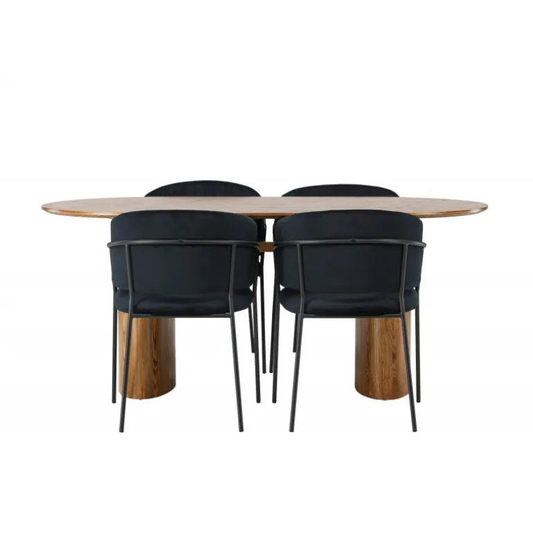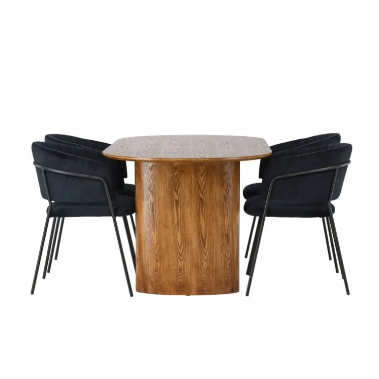 Sæt et personligt præg på din indretningsstil med et imponerende Spisebordssæt, der udstråler varme, harmoni og stil i vores nordiske design! Med det trendy ovale spisebord i naturtræ fra Isolde-serien, løfter vi din spisestueindretning til et helt nyt niveau. Hvert eneste detalje er omhyggeligt udformet. Med sin ovale MDF-bordplade og robuste ramme giver spisebordet en følelse af holdbarhed, og det naturlige materiale bliver et attraktivt fokuspunkt. Bordets dimensioner: 140×75 cm. Sammen med det træfarvede spisebord præsenterer vi vores sorte fløjlstole, Selma. Det fuldt polstrede design med en let afrundet ryg og en glat fløjlsstofsæde sikrer ikke kun maksimal komfort, men også en æstetisk behagelig oplevelse. De elegante dekorative sømme tilføjer et strejf af luksus, mens de sorte stålben giver en moderne kontrast. Lad Isolde og Selma blive hjertet i dit hjem, hvor måltider bliver til mindeværdige øjeblikke. Gør dig klar til at byde familie og venner velkommen til en unik atmosfære af stil og harmoni!