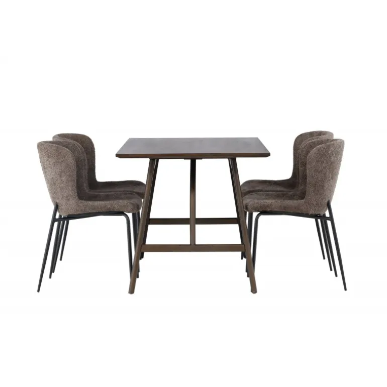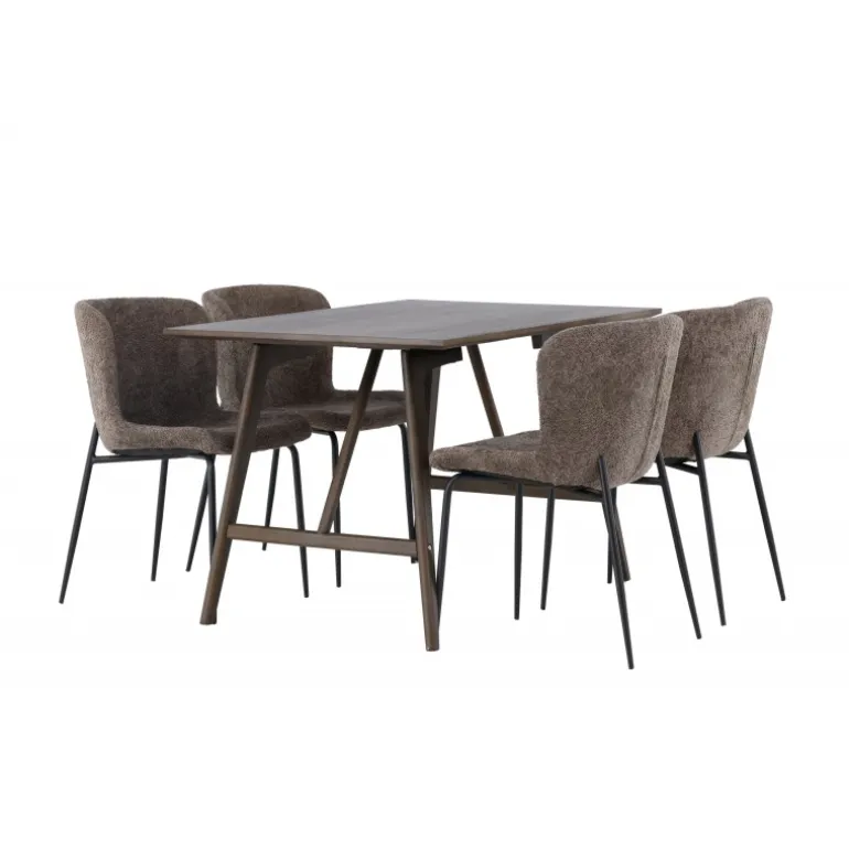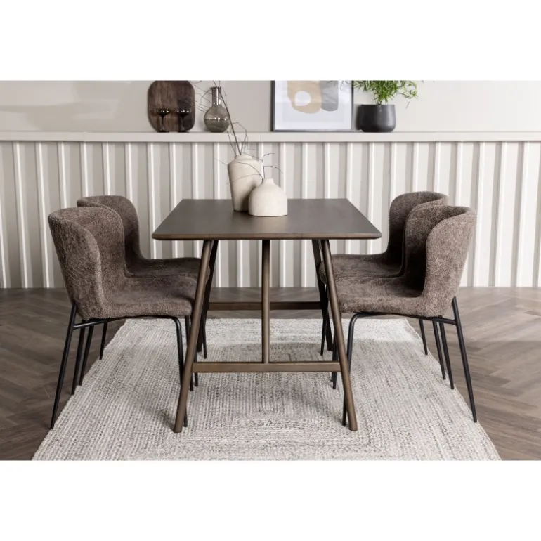 Sid komfortabelt og behageligt omkring dette runde Spisebordssæt, som udstråler luksus, komfort og charme! Vores rektangulære spisebord fra Kaseindon-serien har en høj kvalitets MDF bordplade med en stilfuld mat finish. De let udadbuede ben i gummitræ tilføjer et ekstra touch af skandinavisk design og giver naturligvis også god stabilitet. Det har en trendy valnøddebrun farve, der passer godt til moderne hjem. Bordets dimensioner er 80×120 cm. Sammen med vores polstrede spisebordsstole fra Modesto-serien bliver dette Spisebordssæt endnu mere imponerende. Stolene er betrukket med gråt plys stof, som forstærker følelsen af luksus. De slanke sorte metalben på stolene tilføjer et moderne præg, og den let buede rygstøtte og polstrede sædepude giver dejlig komfort, så du kan nyde lange og behagelige måltider med familie og venner. Skab mindeværdige øjeblikke og nyd hvert måltid med Kaseidon og Modesto Spisebordssættet. Giv dit hjem et strejf af elegance og komfort, der vil imponere både dig og dine gæster!