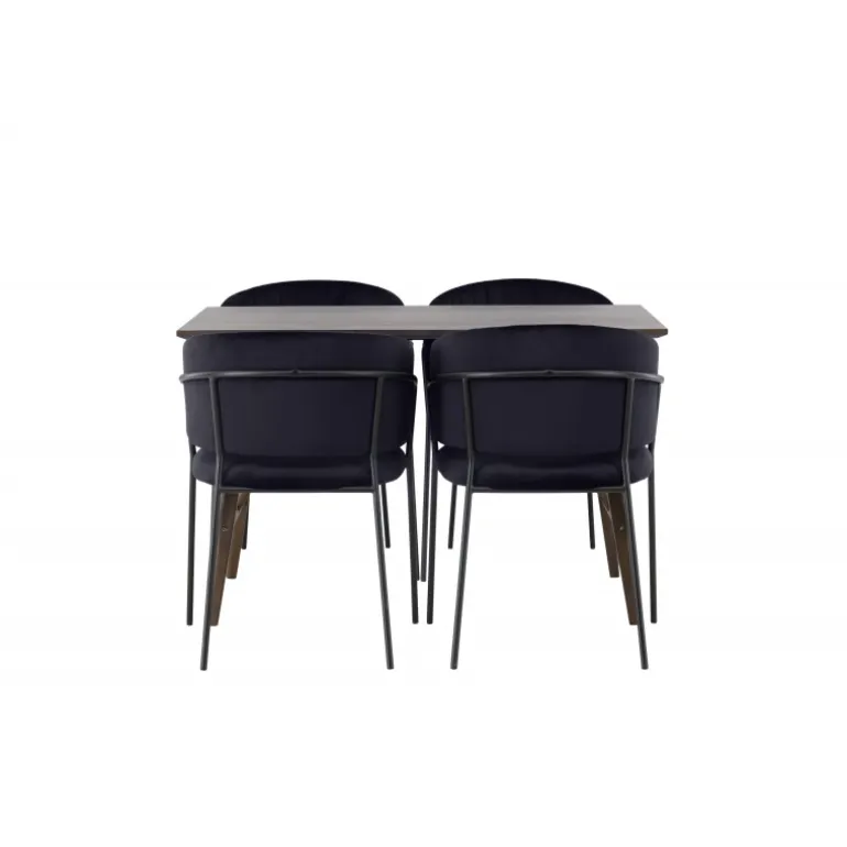 Indret stuen med moderne design og bløde former! Det rektangulære spisebord Kaseindon er perfekt til den stilfulde indretning med sin smukke valnøddefarve. Bordpladen har en elegant, mat finish, der giver et sofistikeret udseende, og benene er let flarede med en stabiliserende ramme. Fremstillet med bæredygtige materialer som MDF og gummitræ får du et bord, der holder i mange år. Bordets dimensioner: 120×80 cm. Her i stilfuld kombination med sorte spisebordsstole fra Selma-serien. Disse stole har et fremragende fuldpolstret design med en let afrundet ryg og en sædehynde i luksuriøst velourstof. Hvert eneste detalje er omhyggeligt udformet med dekorative syninger, der tilføjer et ekstra strejf af elegance. Stolens ben er smalle i sort stål, hvilket giver en stilfuld kontrast til den bløde stol. Lad jeres tid her være dagens højdepunkt og bemærk, hvordan jeres måltider forlænger sig i fremtiden!