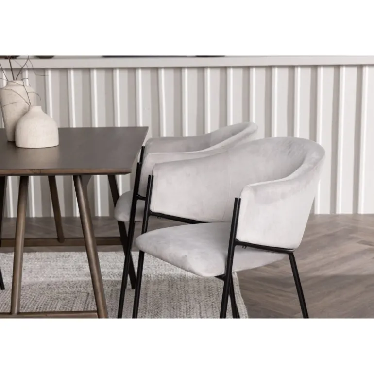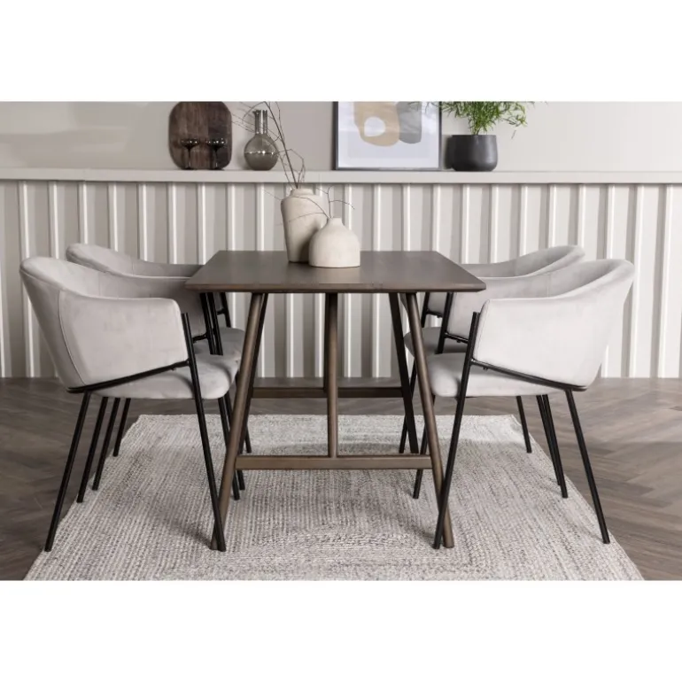 Det skal føles fantastisk at komme hjem. Dette Spisebordssæt går ikke på kompromis med hverken komfort eller stil og er garanteret at blive et populært midtpunkt i dit hjem! Vores rektangulære spisebord, Kaseidon, er perfekt til både køkkenet og stuen. Den rektangulære bordplade lavet af MDF giver en glat overflade, og de let skråtstillede ben af gummitræ giver bordet et subtilt touch af balanceret design. Bordet kommer i en fantastisk valnøddefarve, der komplementerer det elegante hjem perfekt. Bordets dimensioner er 80×120 cm. Sammen med vores moderne spisestole fra Evelina-serien skaber du et komplet Spisebordssæt, der imponerer. Den fuldt polstrede sæde i lysegråt velourstof tilbyder en blød og luksuriøs følelse. Den buede ryglæn giver ekstra komfort, mens den tilføjer et stilfuldt touch til stolen. Stolens minimalistiske sorte stålramme skaber en moderne kontrast til det lyse sæde, hvilket gør det til et stilfuldt fokuspunkt. Hvad mere kan man ønske sig? Indret dit hjem med slanke former, behagelig komfort og tidløst design!