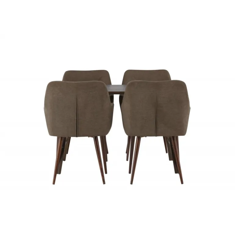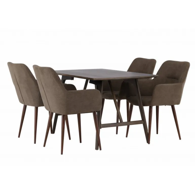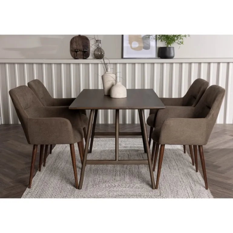 Skab en indbydende atmosfære med dette jordnære Spisebordssæt i skandinavisk design! Vores rektangulære spisebord, Kaseindon, har en slank bordplade og let udadbuede ben, alle lavet af MDF og gummitræ. Den valnøddebrune farve tilføjer en moderne og sofistikeret touch til din stue, perfekt i tråd med de nuværende trends. Bordet måler 120×80 cm. Her, i perfekt kombination, er spisestolene fra Tomorrow-serien. Stolens fuldt polstrede sæde i brun polyesterstof giver en blød og luksuriøs følelse, mens de integrerede armlæn tilbyder ekstra støtte og komfort. Stolens ben, i den moderne valnøddebrune farve, fortsætter de harmoniske æstetikker fra bordet og skaber en sammenhængende helhed. Med Kaseindon Spisebordssættet og Tomorrow spisestolene får du ikke kun et sted at samles omkring, men også en atmosfære fyldt med kærlighed og fællesskab, der uden tvivl vil forbedre dine måltider i fremtiden!