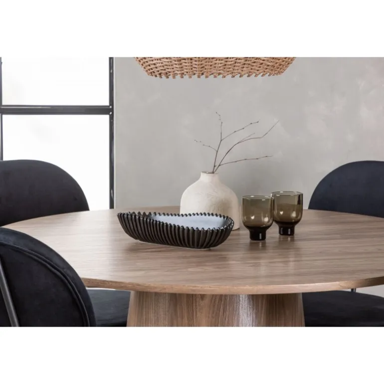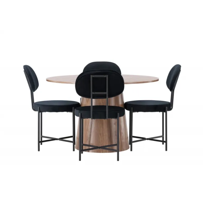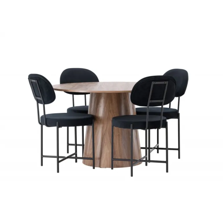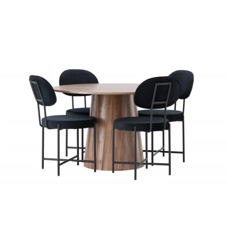 Med et øje for detaljer og evnen til at kombinere stil og funktionalitet, løfter dette spisebordssæt det indendørs miljø til nye højder! Vores runde spisebord, Lanzo, har et smagfuldt design og gennemtænkte detaljer, der giver det en følelse af tidløshed. Bordets runde MDF-bordplade tilføjer et sofistikeret touch, mens den snoede cylindriske base skaber en unik og moderne æstetik. Den jordfarvede nuance fremhæver materialets naturlige mønstre og skaber en indbydende atmosfære i rummet. Bordet måler 120cm i diameter. Her har vi kombineret det træfarvede Lanzo spisebord med de elegante Stella spisebordsstole for en komplet oplevelse af komfort og trendy design. Stolens afrundede sæde og ryg i sort velourstof giver ikke kun en blød og behagelig fornemmelse, men tilføjer også et strejf af luksus til din bolig. De minimalistiske sorte stålben på stolene bidrager til den moderne æstetik og skaber balance mellem enkelhed og elegance. Lanzo og Stella er det perfekte par for dem, der værdsætter både stil og komfort. Uanset om du nyder en hyggelig middag eller inviterer venner og familie til fest, vil dette spisebordssæt passe perfekt!