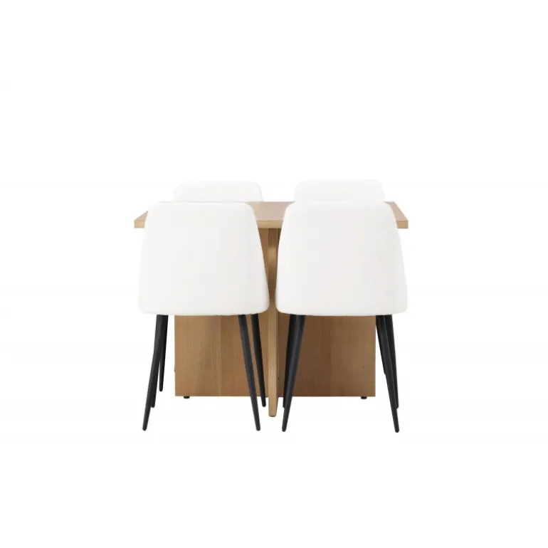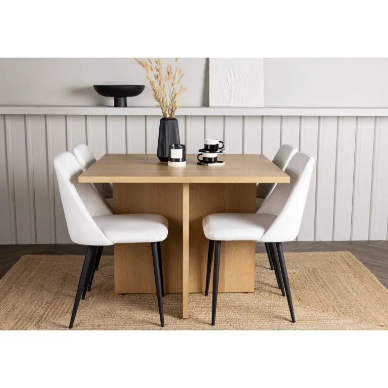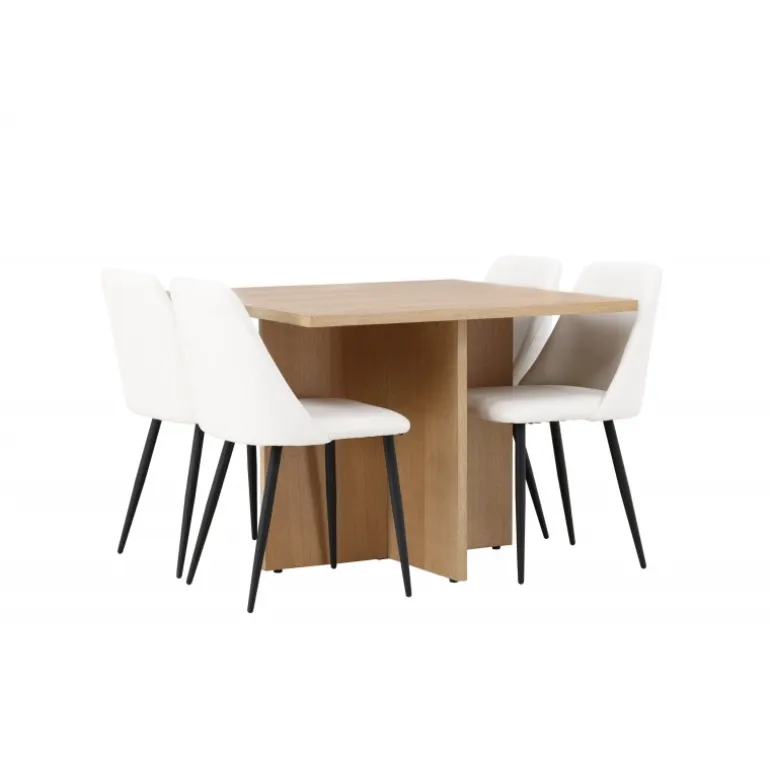 Spred varme og hygge i dit hjem med et naturinspireret træSpisebordssæt, der kombinerer slanke former med klassisk design! Vores smukke, træfarvede spisebord Leo er lavet af egetræsfarget MDF og har en kvadratisk bordplade, der giver en elegant og moderne følelse. Med sine krydsede trælister som ramme er bordet både stabilt og æstetisk tiltalende. Bordets dimensioner: 100×100 cm. For at komplementere det kvadratiske spisebord har vi valgt stole fra den populære Night-serie. Disse stole har et eksklusivt touch med fuldt polstrede sæder i hvidt kunstlæder og sorte stoleben, hvilket skaber en stilfuld kontrast. Stolens design og polstring bidrager til et dristigt og personligt fokuspunkt, der vil imponere både dig og dine gæster. Med dette Spisebordssæt har du mulighed for at skabe et personligt og indbydende miljø, hvor du og dine venner kan nyde fælles måltider, lige så stilfulde som komfortable!