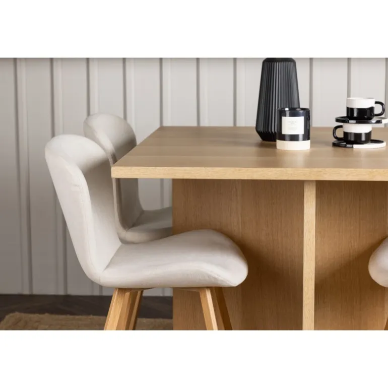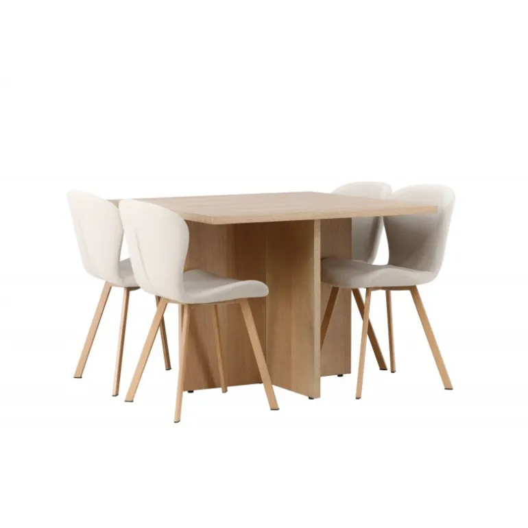 Et elegant Spisebordssæt til det moderne hjem, der fremhæver naturlige materialer på bedste vis! Vores træfarvede spisebord Leo er en imponerende kombination af funktionalitet og stil. Lavet af robust egetræsfarvet MDF, har dette bord en firkantet bordplade og et krydset træstel, der giver både stabilitet og karakter. Med sin kompakte størrelse passer det lige godt i et mindre køkken eller stue. Bordets dimensioner: 100x100cm. Sammen med vores beige spisestole Lilja, bliver dette Spisebordssæt komplet. Denne stol er en drøm med sit lyse beige polyesterstof, som tilføjer en luksuriøs følelse til dit interiør. Det fuldt polstrede sæde tilbyder en blød og behagelig oplevelse, og stolens ben er lavet af smukt egetræ med et fladt og let udfladet design for ekstra stabilitet og stil. Med dette firkantede træsæt bliver hvert måltid komfortabelt og behageligt. Skab en indbydende og moderne atmosfære i dit hjem – her får du alt, hvad du har brug for!