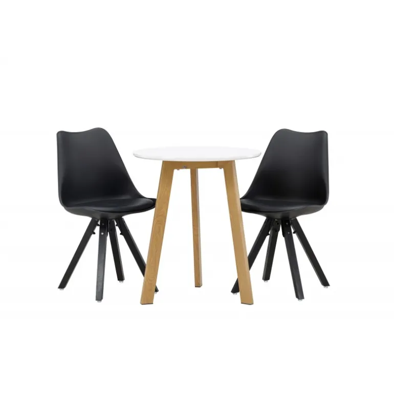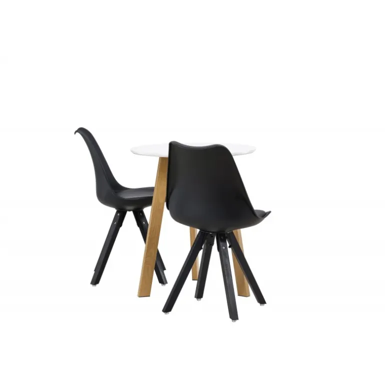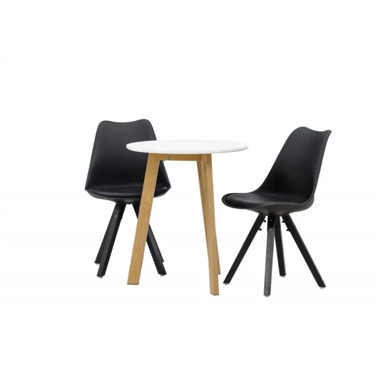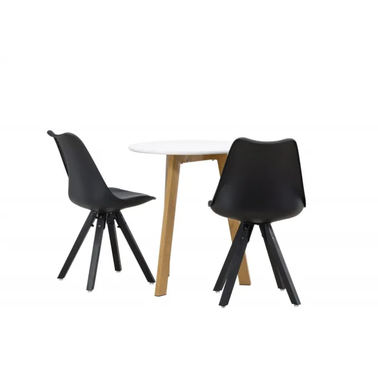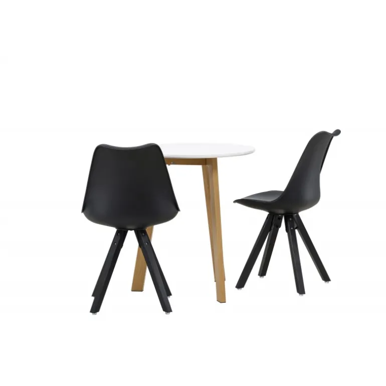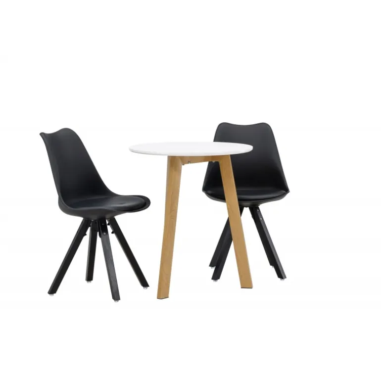 Skab en indbydende atmosfære! Det runde spisebord Leonora har en rund bordplade i hvid MDF og et trebenet stel i en smuk egetræ look. Her i stilfuld kombination med bæredygtige spisebordsstole fra Zeno-serien. Stolen har et indbydende design med ryglæn og sæde i sort plast, indbygget sædehynde med høj komfort og fire skråtstillede ben i sort træ. Her sidder du lige så smart som komfortabelt! Bordets diameter: 65 cm.